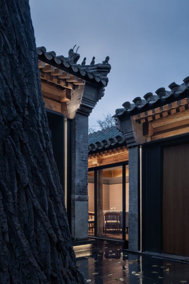 Guests step through a red wooden gate into a world of grey tiled roofs, wooden eaves, black walls, and ancient trees. This entrance sequence recalls the charm of old Beijing, evoking a sense of serenity and history before the dining experience begins. Every detail—down to the bricks and tiles—acts like a verse of poetry, a cultural reminder of a Beijing that is fading from memory.