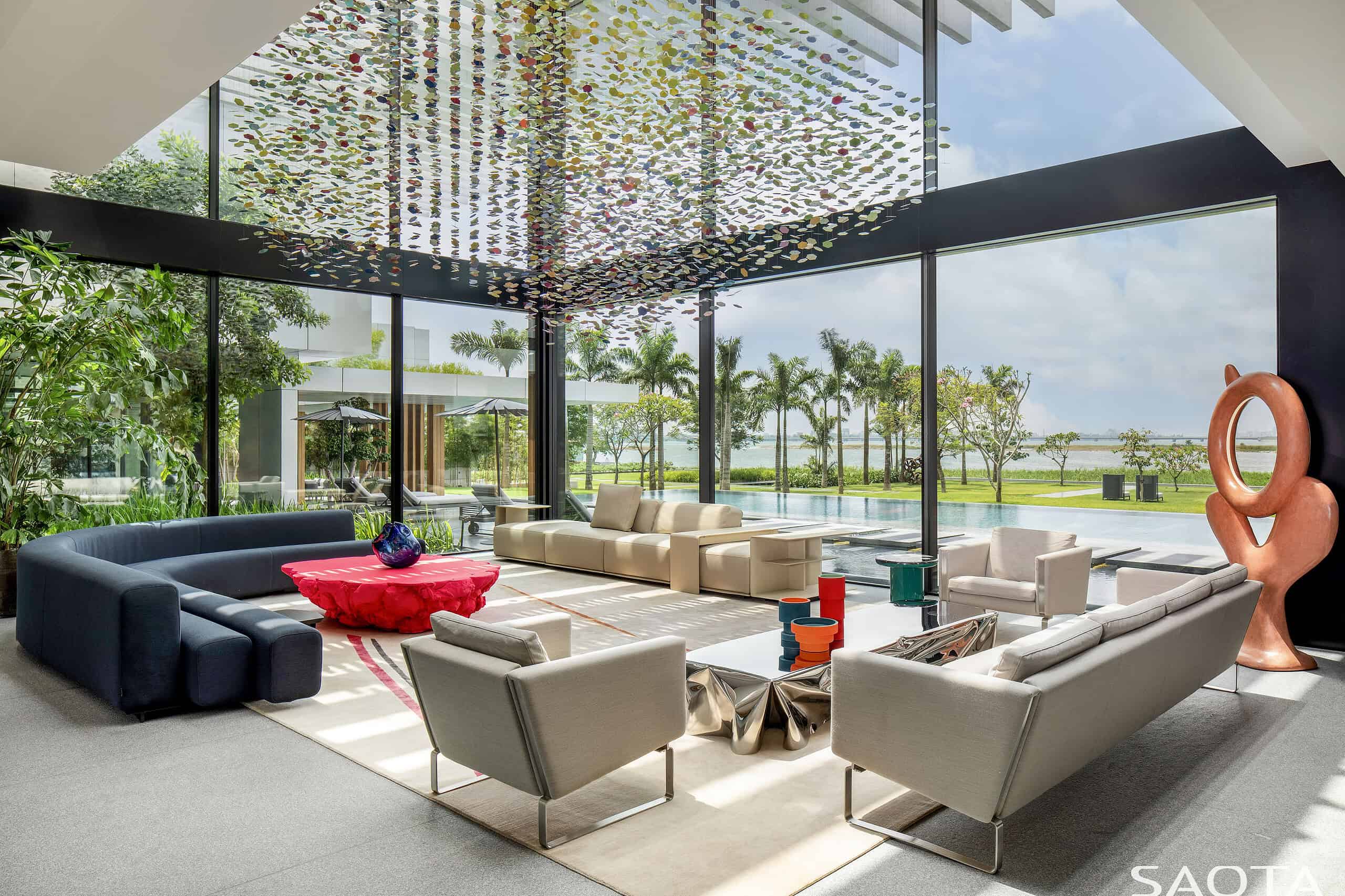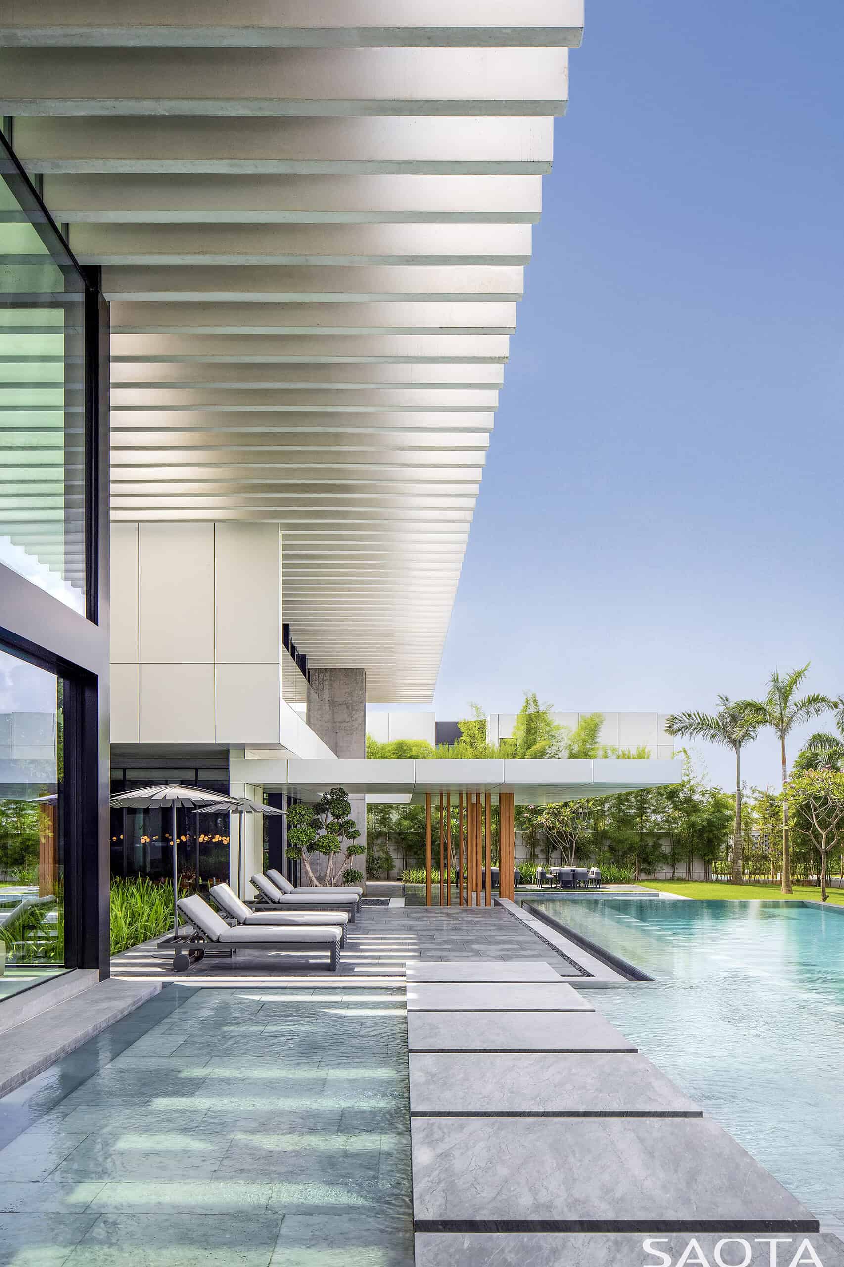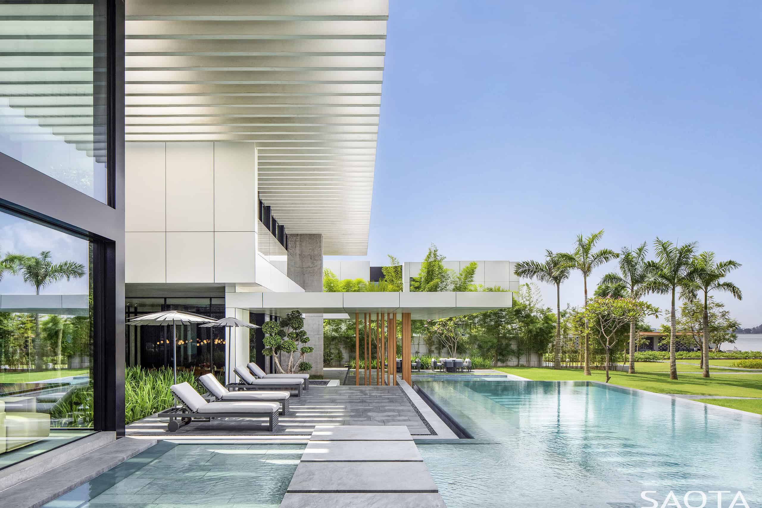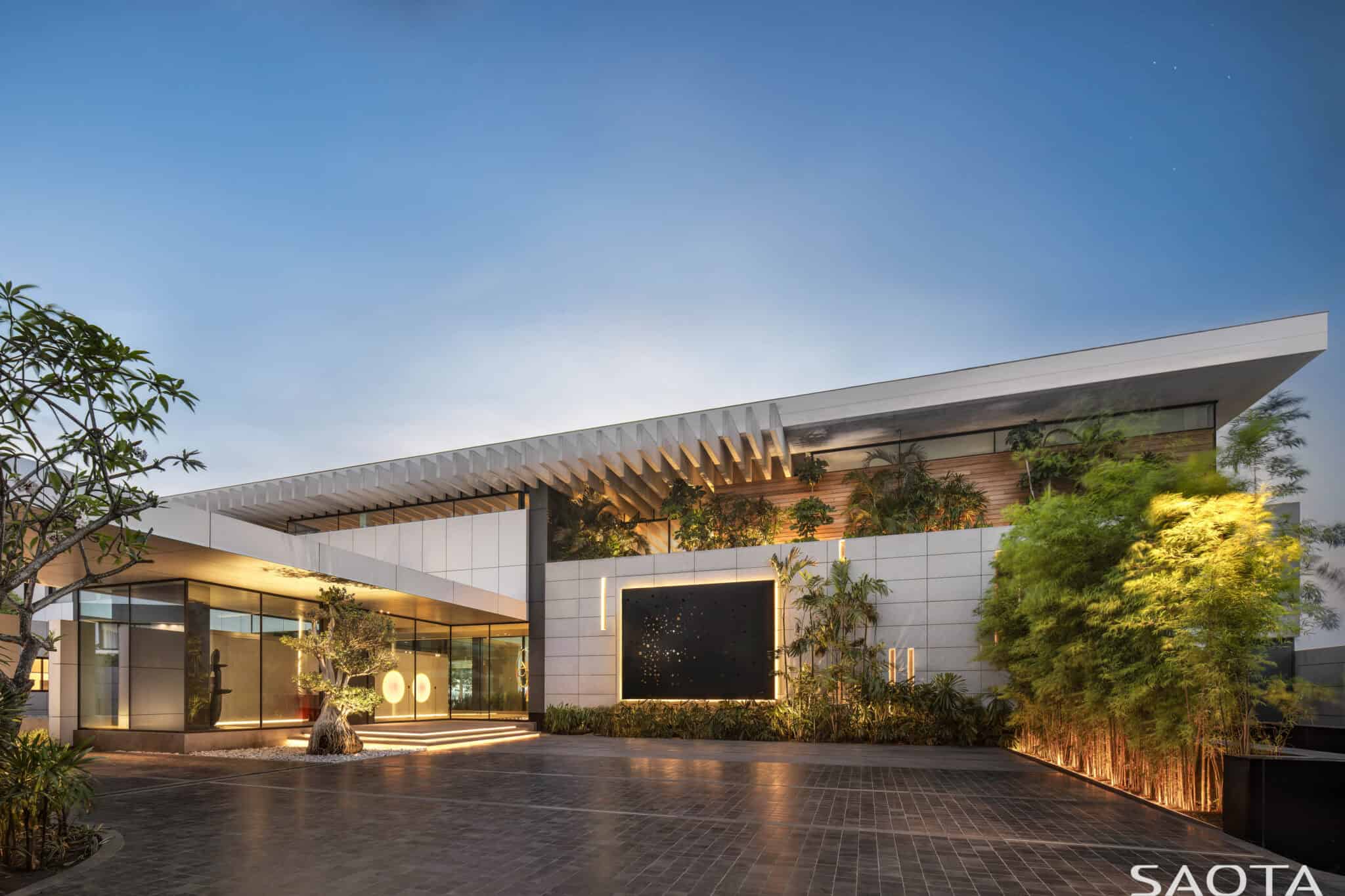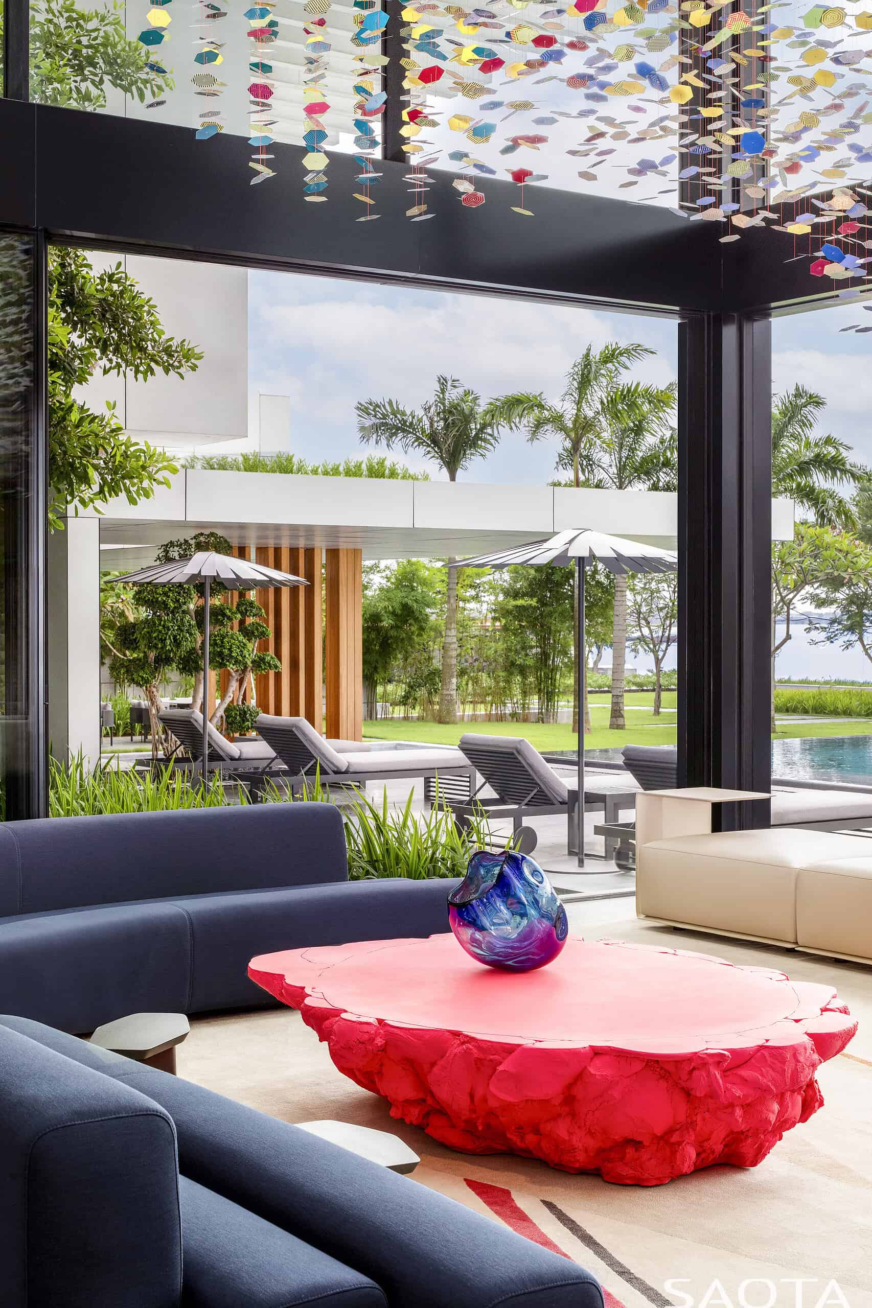 The villa’s standout feature is its permeable roof, a graceful canopy of concrete beams interspersed with skylights. This architectural gesture mimics sunlight filtering through foliage, casting dappled light across the interiors and connecting the home to its lush surroundings. Tiered courtyards and verdant landscaping further soften the transitions between indoor and outdoor spaces.