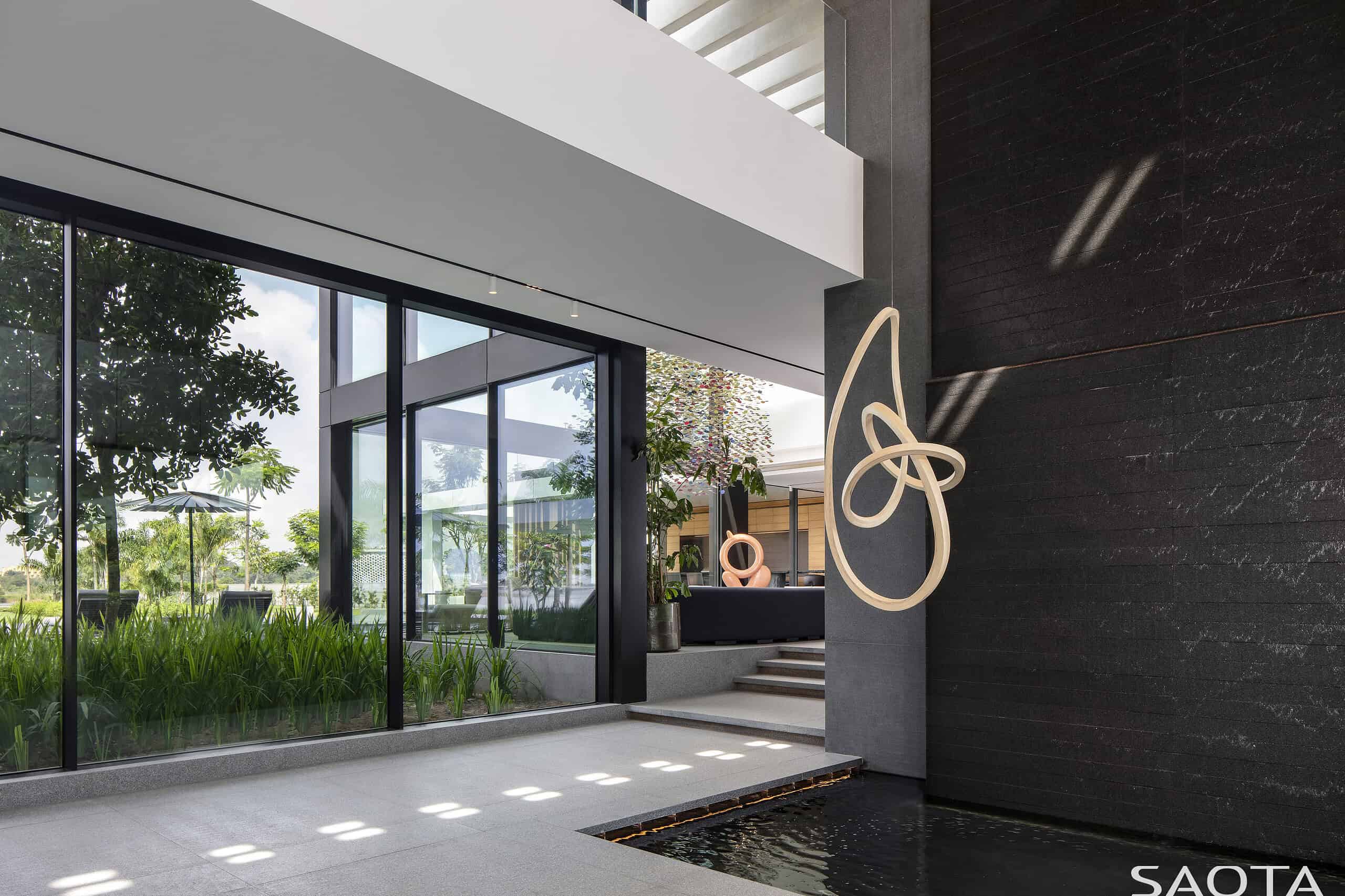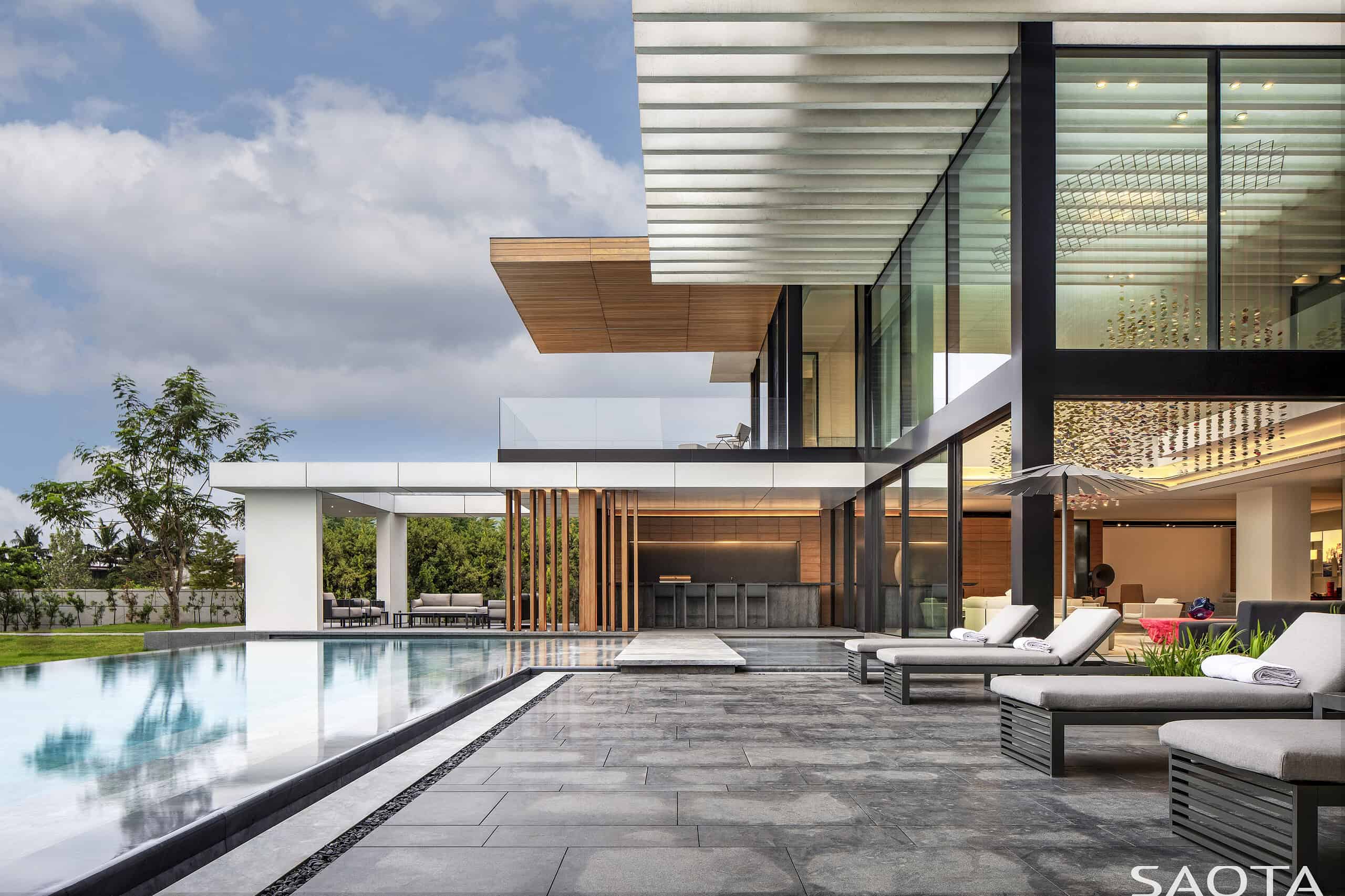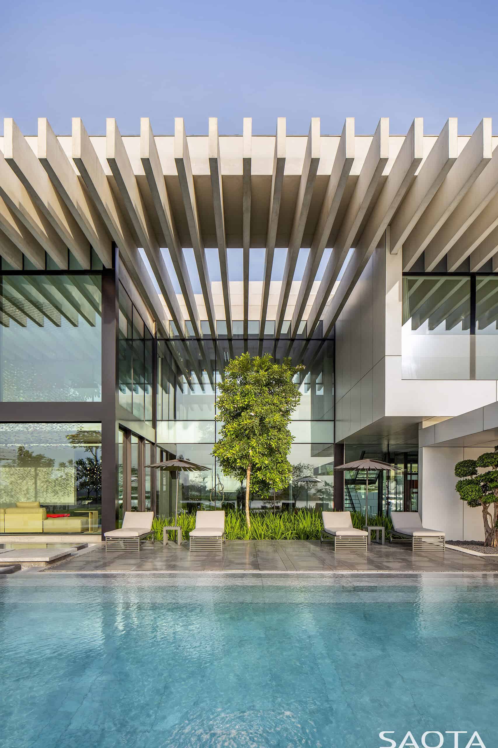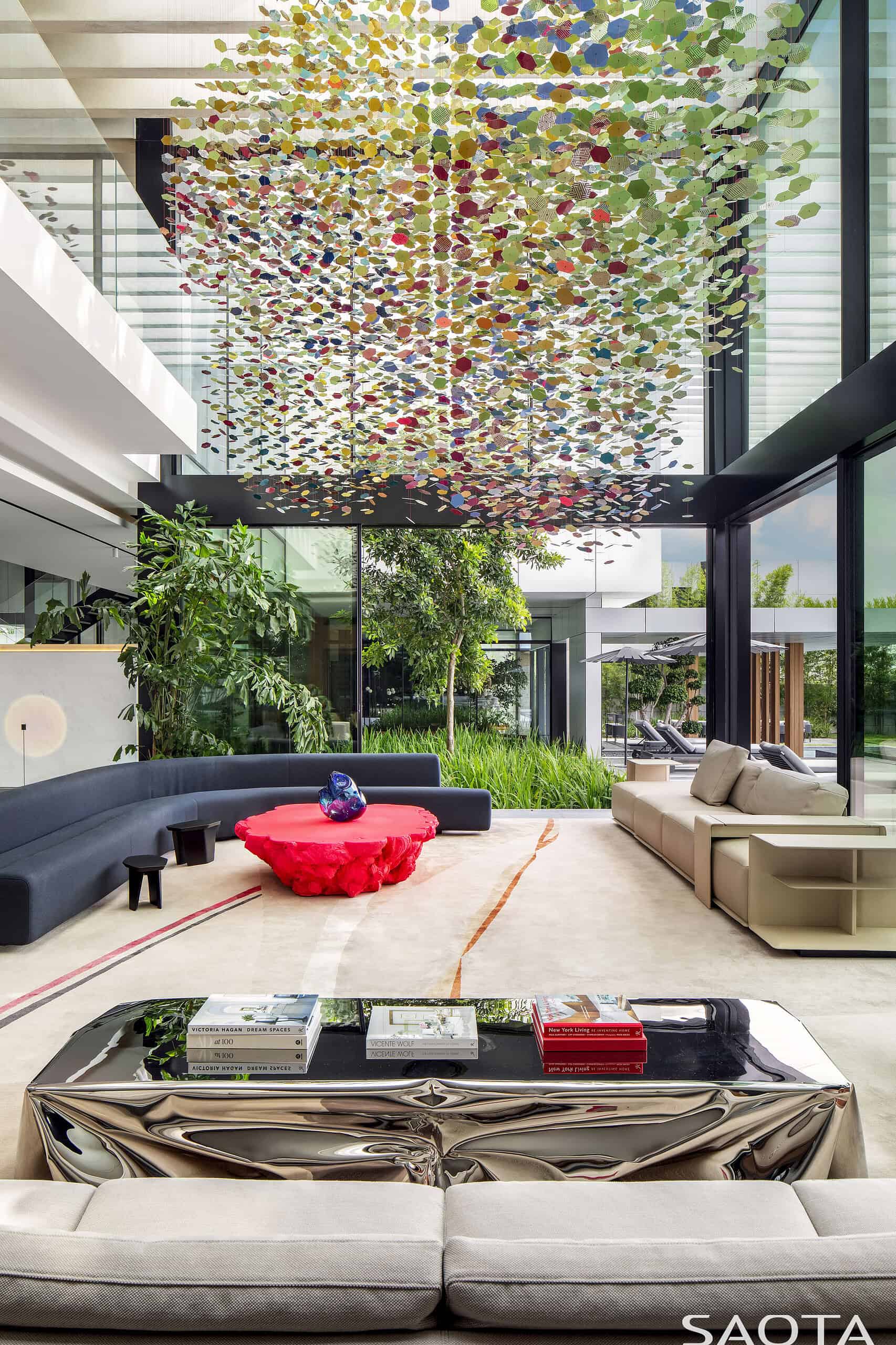 The villa’s standout feature is its permeable roof, a graceful canopy of concrete beams interspersed with skylights. This architectural gesture mimics sunlight filtering through foliage, casting dappled light across the interiors and connecting the home to its lush surroundings. Tiered courtyards and verdant landscaping further soften the transitions between indoor and outdoor spaces.