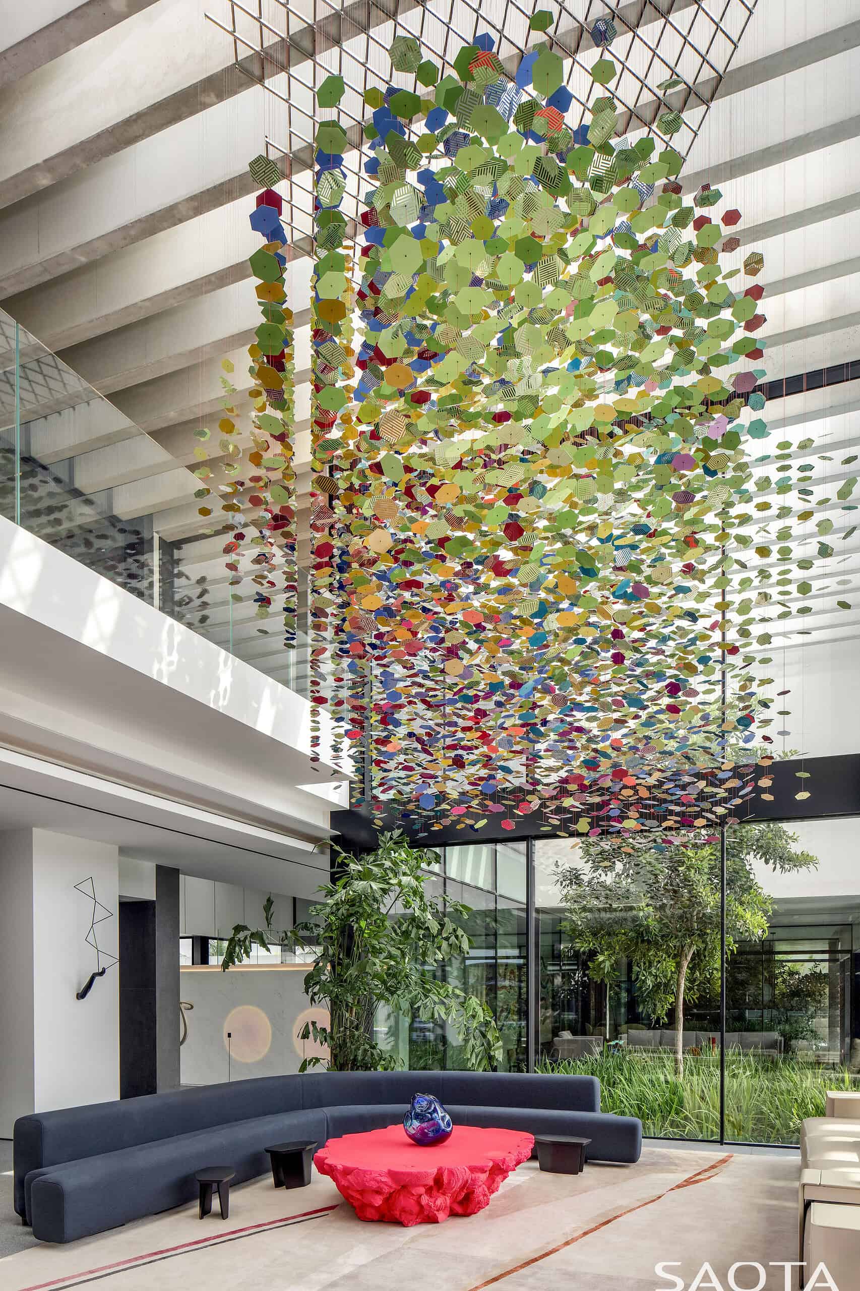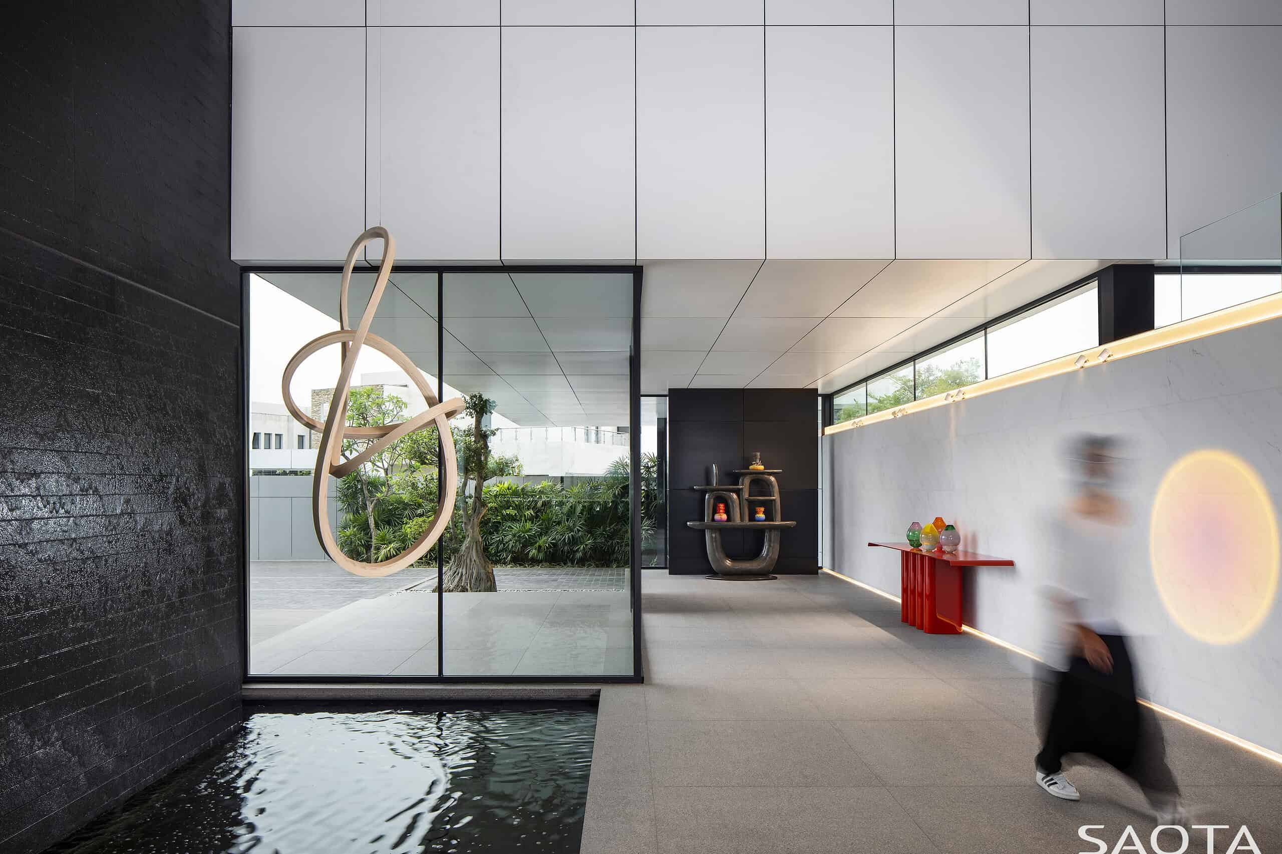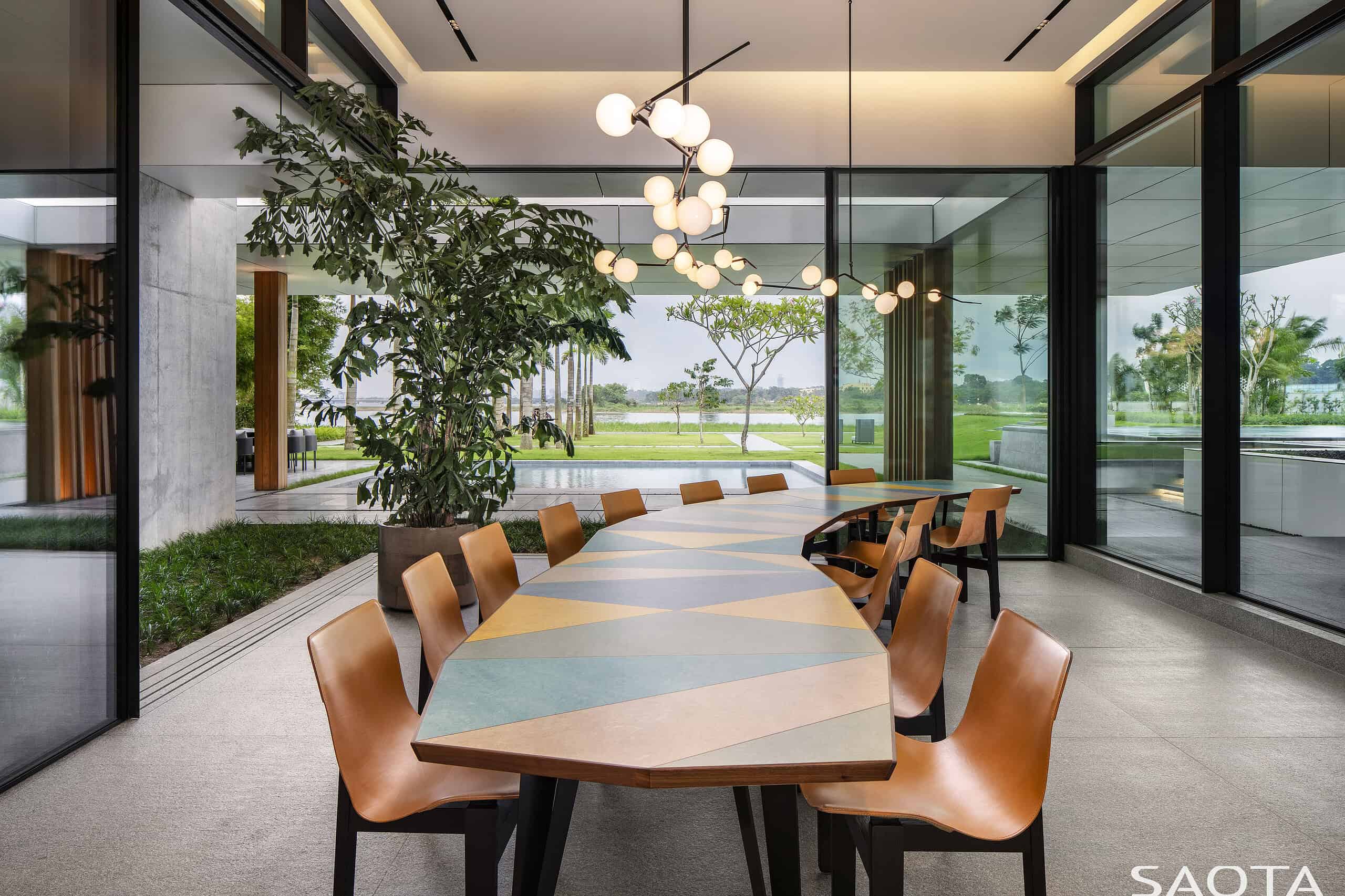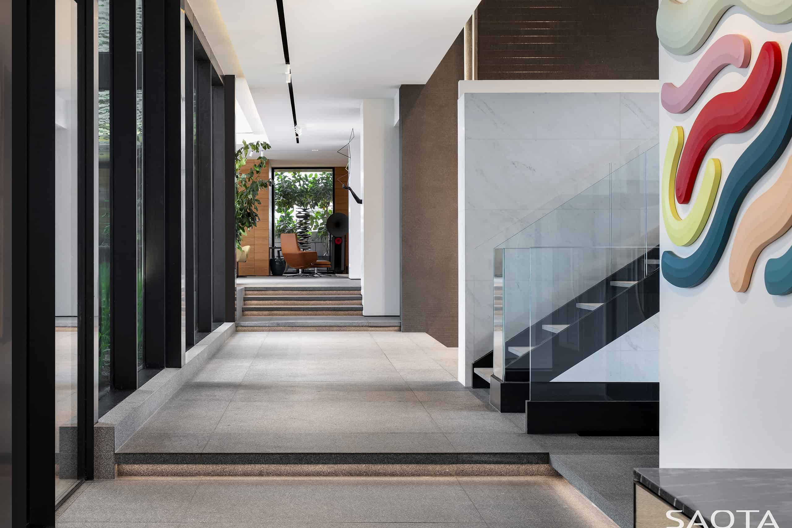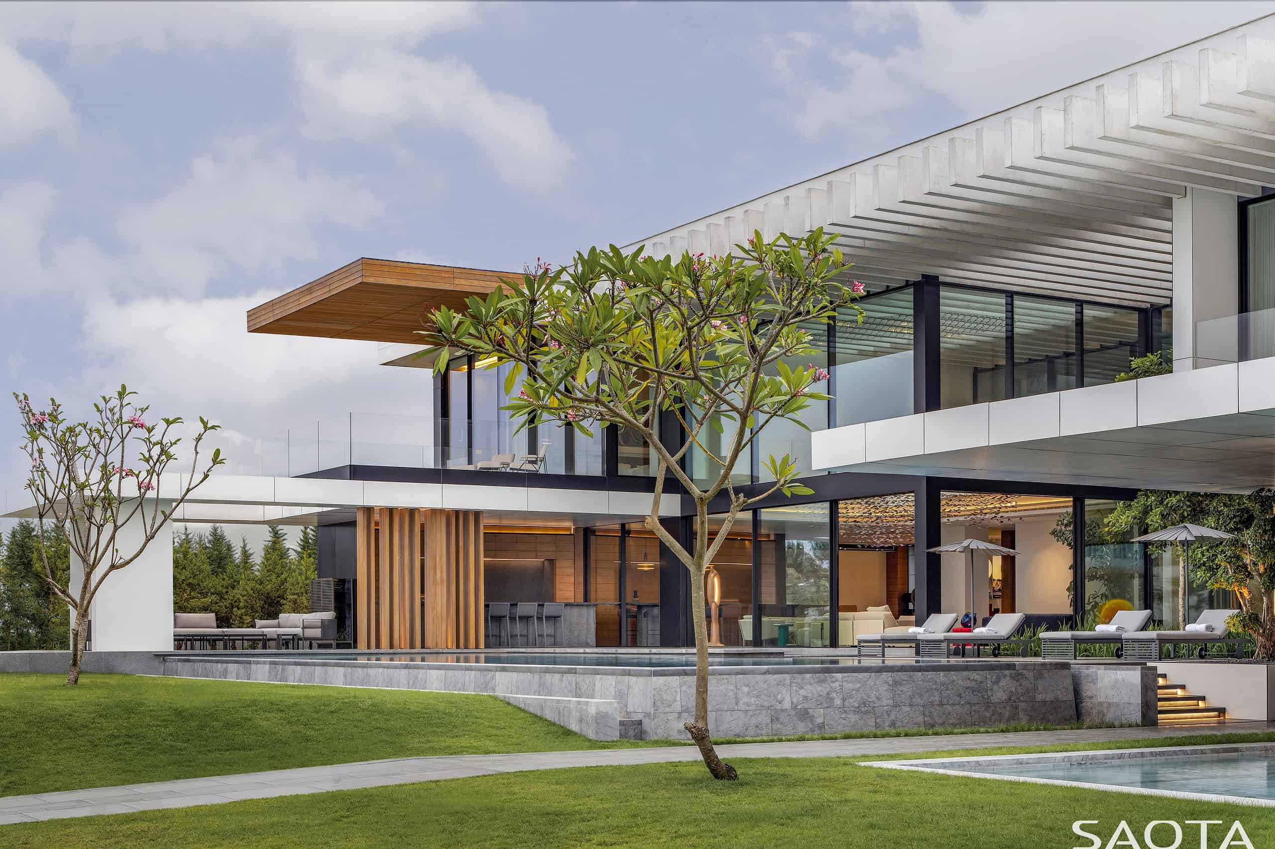 The villa’s standout feature is its permeable roof, a graceful canopy of concrete beams interspersed with skylights. This architectural gesture mimics sunlight filtering through foliage, casting dappled light across the interiors and connecting the home to its lush surroundings. Tiered courtyards and verdant landscaping further soften the transitions between indoor and outdoor spaces.