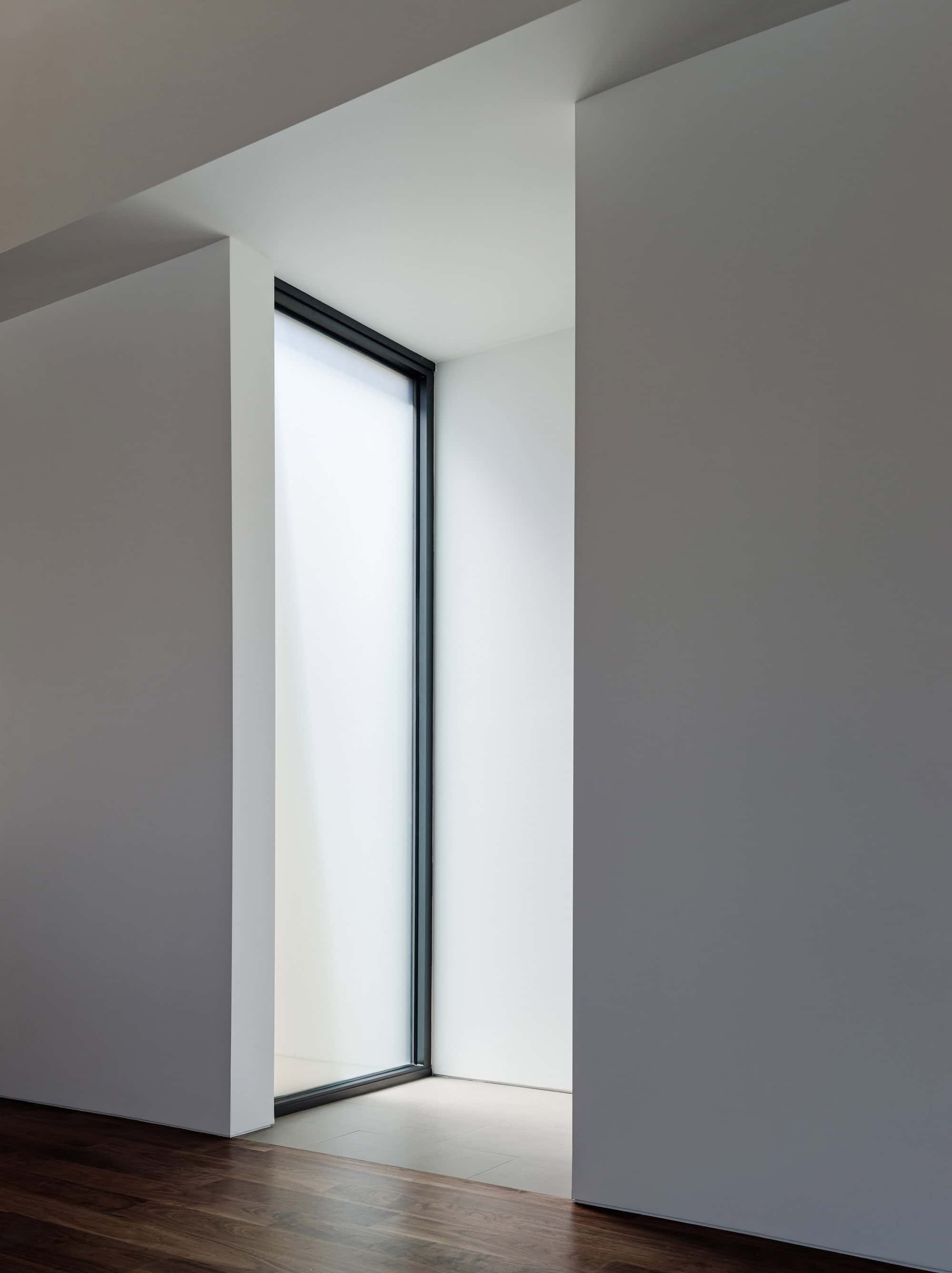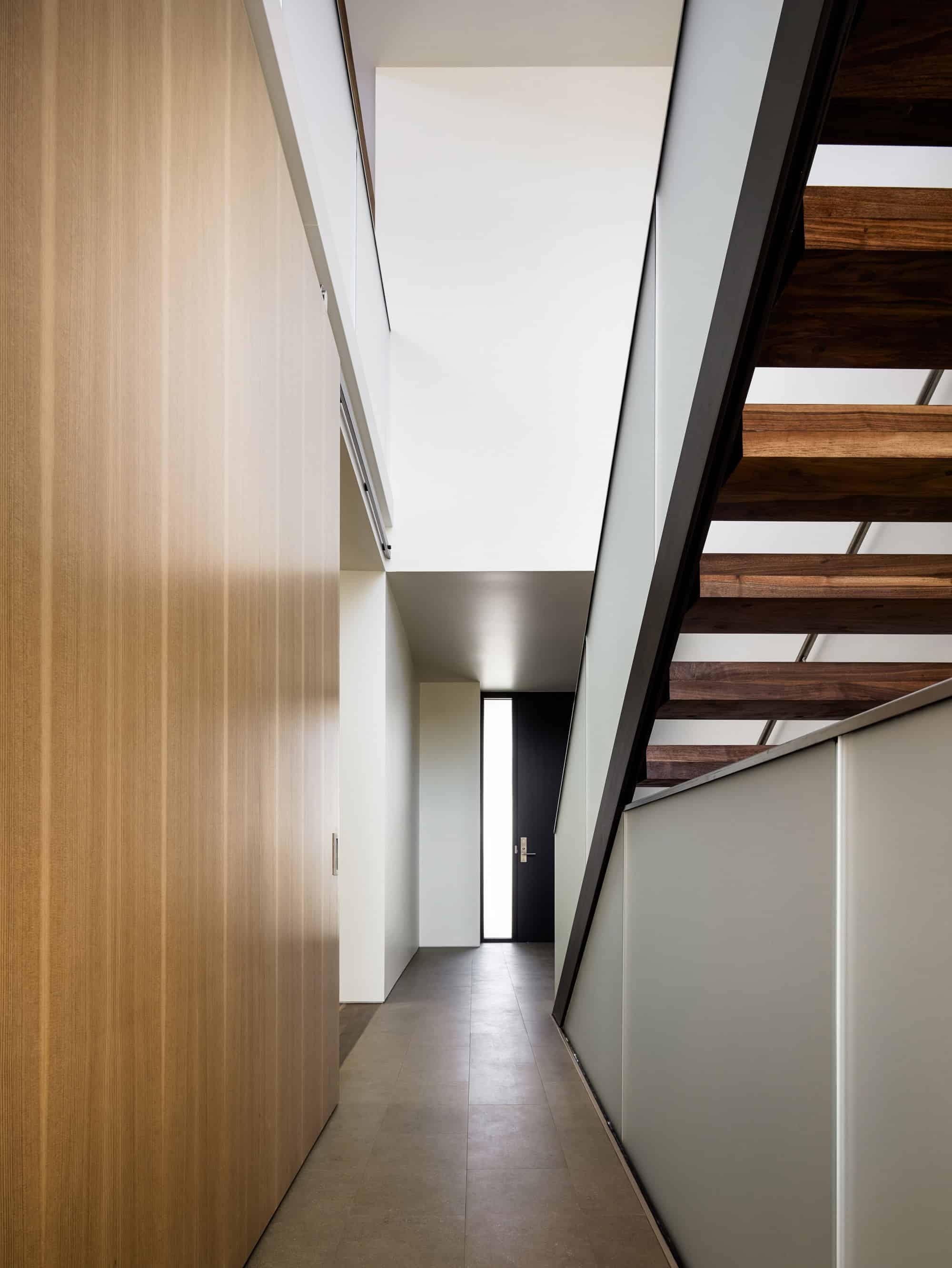 In addition to a clear relationship between the various program elements, bringing daylight deep into the building proved to be a driving factor in the design. Given that the building is located in a tight urban condition, this created a challenge for extending daylight into the building in a meaningful way. The amount of glass at the front and rear elevations of the building was maximized, but this did not solve the issue at hand. By creating a sloped ceiling at the upper level, this allowed the opportunity for a north-facing clerestory window that brings uniform lighting at the upper living level. A large light well towards the center of the building brings light to bathrooms and hallways below. In addition, the stair hallway carries light down to the bedroom level and entry.