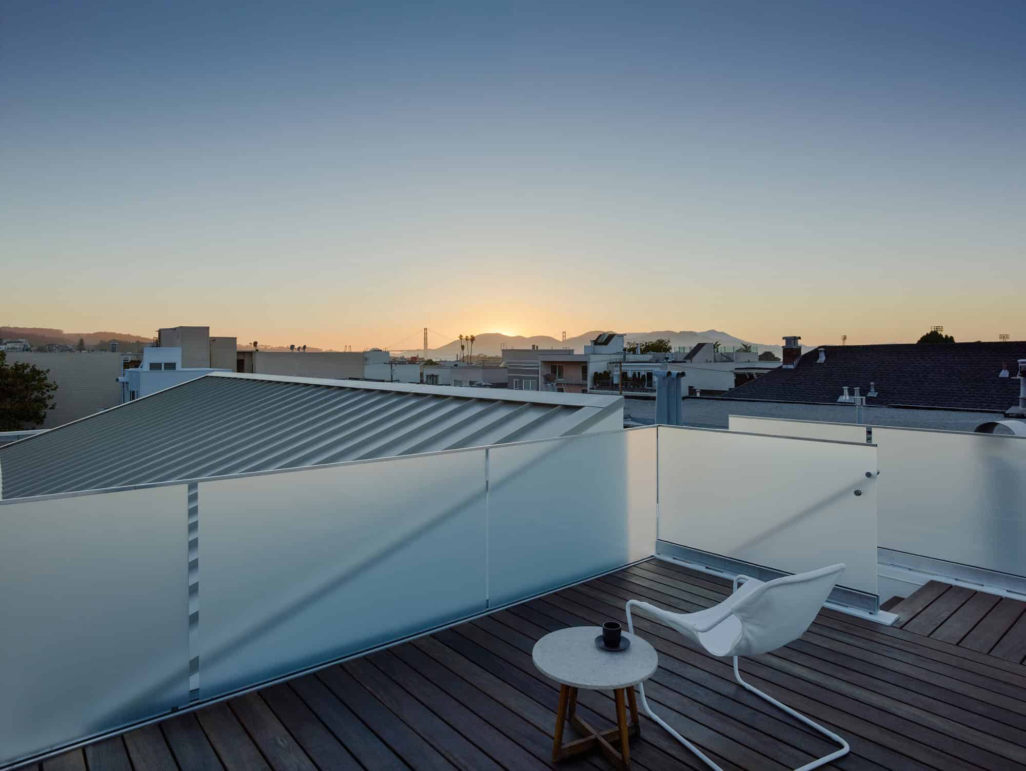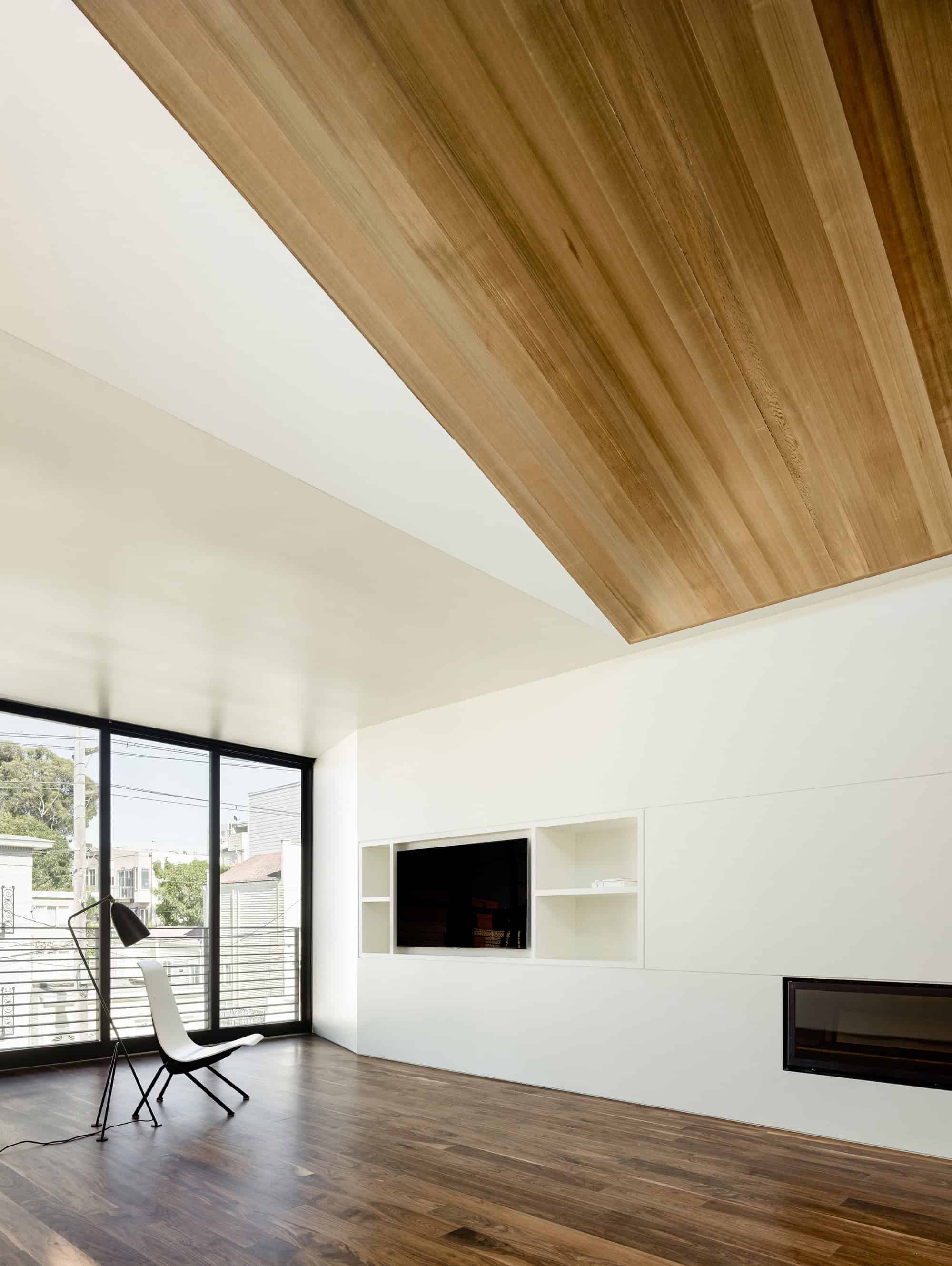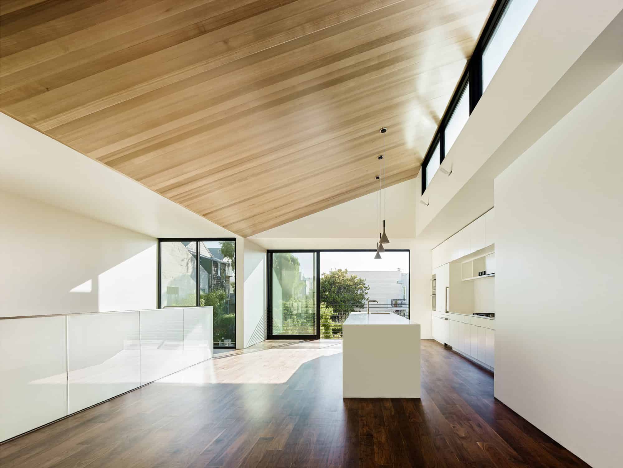 Finally, material selection and composition is given high priority. White plaster is selected as the exterior finish for the upper two levels to take advantage of the diffused lighting condition in the Cow Hollow neighborhood of San Francisco. This plaster is juxtaposed against a rough concrete base that indicates the utilitarian nature of the garage. The use of wood at the sloped upper ceiling brings color and variation into the main living space as light rakes across the boards from the continuous clerestory window. Wood and tiled floors are used as a simple means to bring color into the spaces. Ultimately, proportion is given careful consideration while composing each material and element in relation to one another.