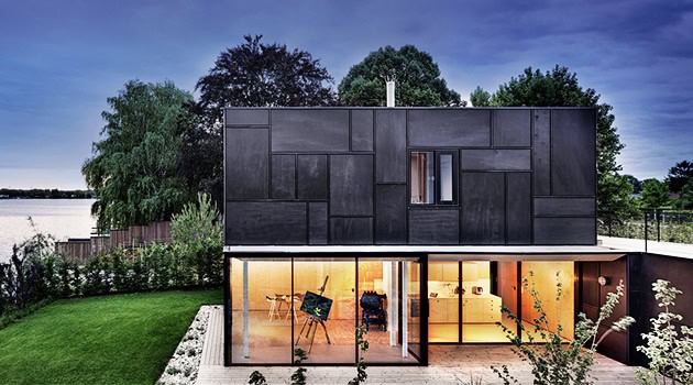 The Lake House is a black timber building with a structure that resembles the shape of a horseshoe. This residence was designed to fully embrace outdoor living as well as to bring the outdoors inside through large glass walls that provide stunning views of the nearby lake.