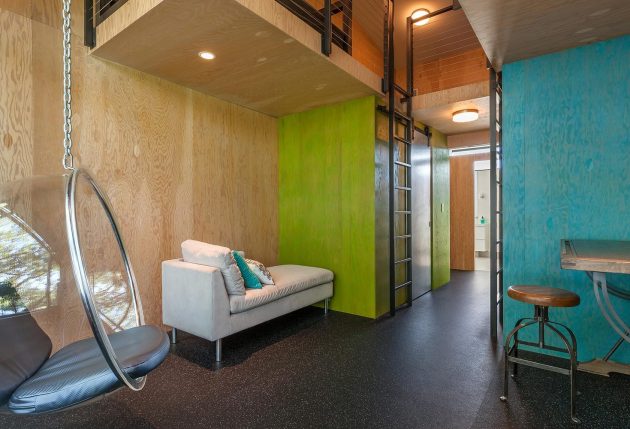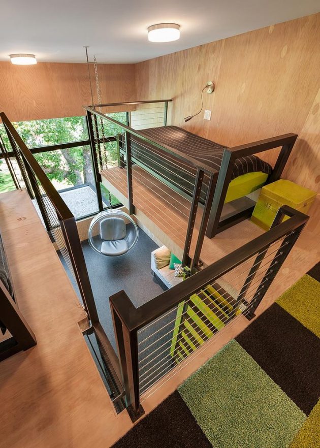 The entry canopy introduces weathering steel as a contrast to the stucco, carrying into the entry foyer as well. Concrete floors with radiant heat, a steel stair, and perforated blackened steel ceilings in the living room and kitchen convey a rigorous modern aesthetic and reduced cost to the finishing of the space. The children’s wing incorporates color stained plywood walls and ceilings, defining an animated, playful environment with dramatic views of the trees, evoking a tree-house imagery.