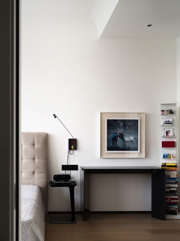 The design of the daughter’ room goes beyond abstract language and embraces a youthful trendy art with a wonderful blend of colors and a playful spirit, getting infinitely closer to real life scenarios and evoking emotional resonance.