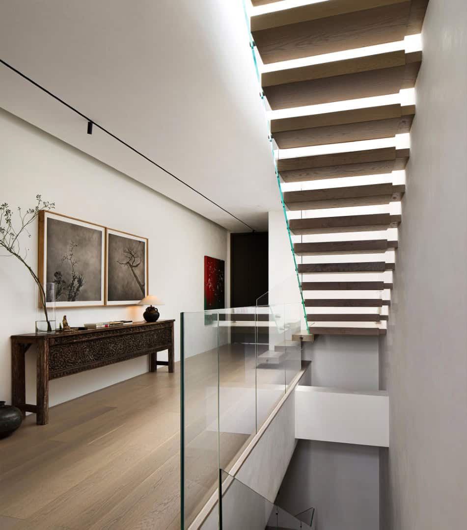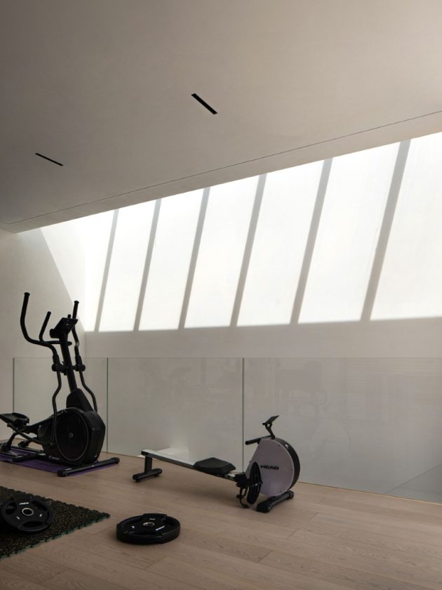The different staircases, as functional bodies and as artistic installations, mitigate the dullness of the space and allow valuable ventilation into the previously gloomy, one-sided negative floor. The overhanging skylight, which follows the transitional order of the active line staircase, brings light and shadow to the space and accompanies the daily trajectory of each family member.
