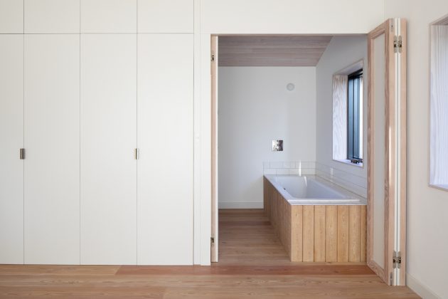 The entrance approach is reserved in appearance and contrasts dramatically with the more open South facade. Once inside, the house opens up dramatically to the spectacular views and sunlight filled interior spaces.