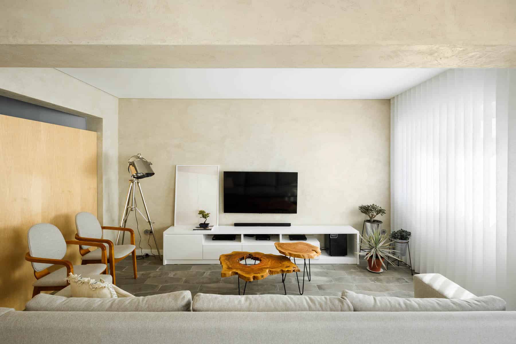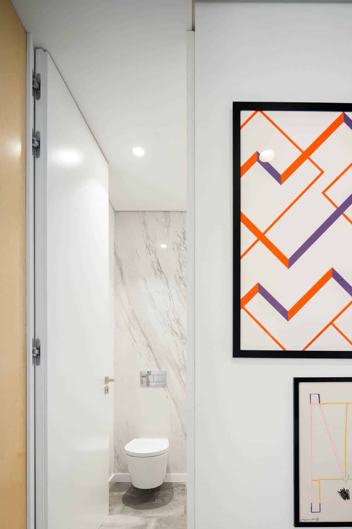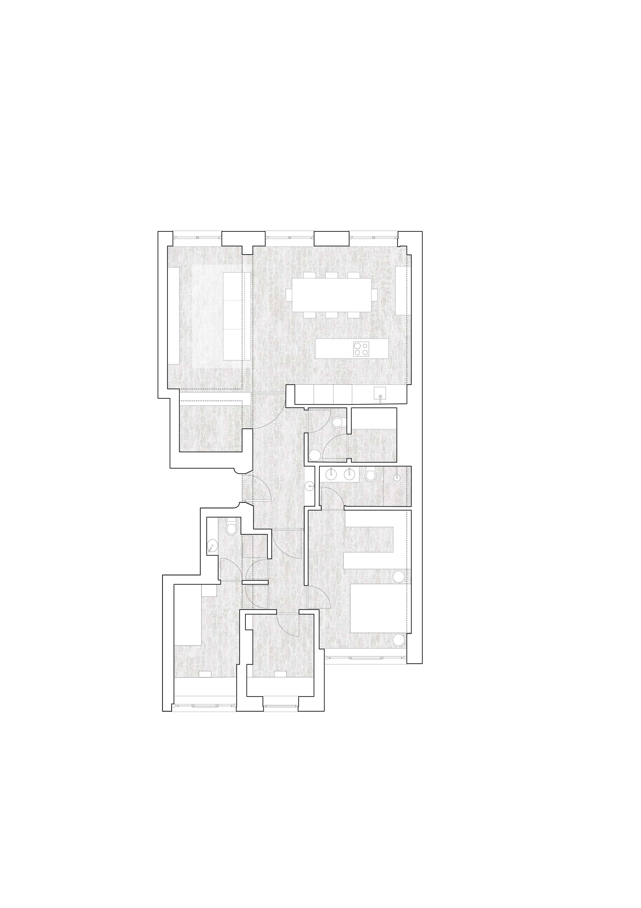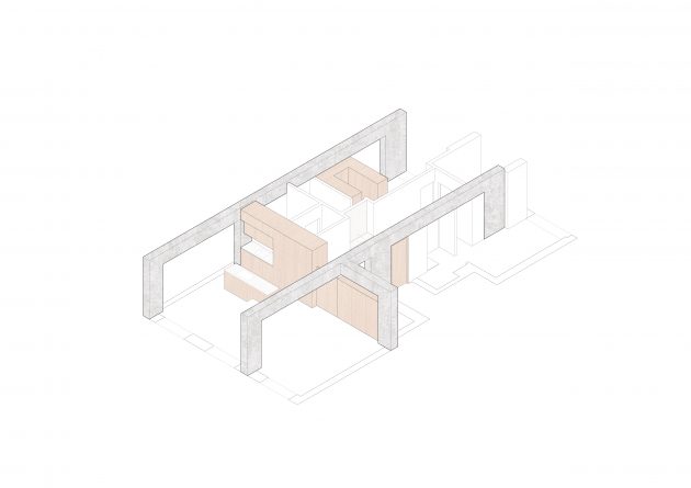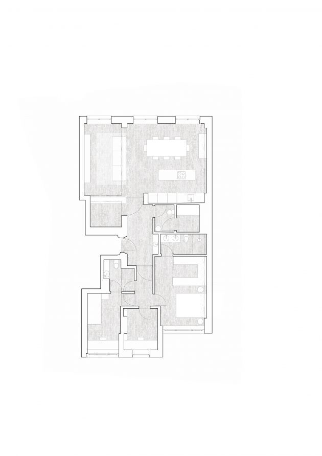 The common areas are open and fluid, with the furniture helping to define their function. The concrete pillars and beams were left visible and became part of the spatiality of the apartment. A hybrid, semi-open room may be used as a study. Next to it, there is a toilet and laundry room. A new hierarchy was created in the bedroom area, with one small bedroom (with a disproportionately sized pillar), a medium-sized room (which could be ensuite, as the toilet has two doors), and a master suite. The suite, which occupies the area where the living room was previously located, is divided into three areas: bed, closet and bathroom. A concrete beam runs the full length of the room, bringing natural light to the suite.