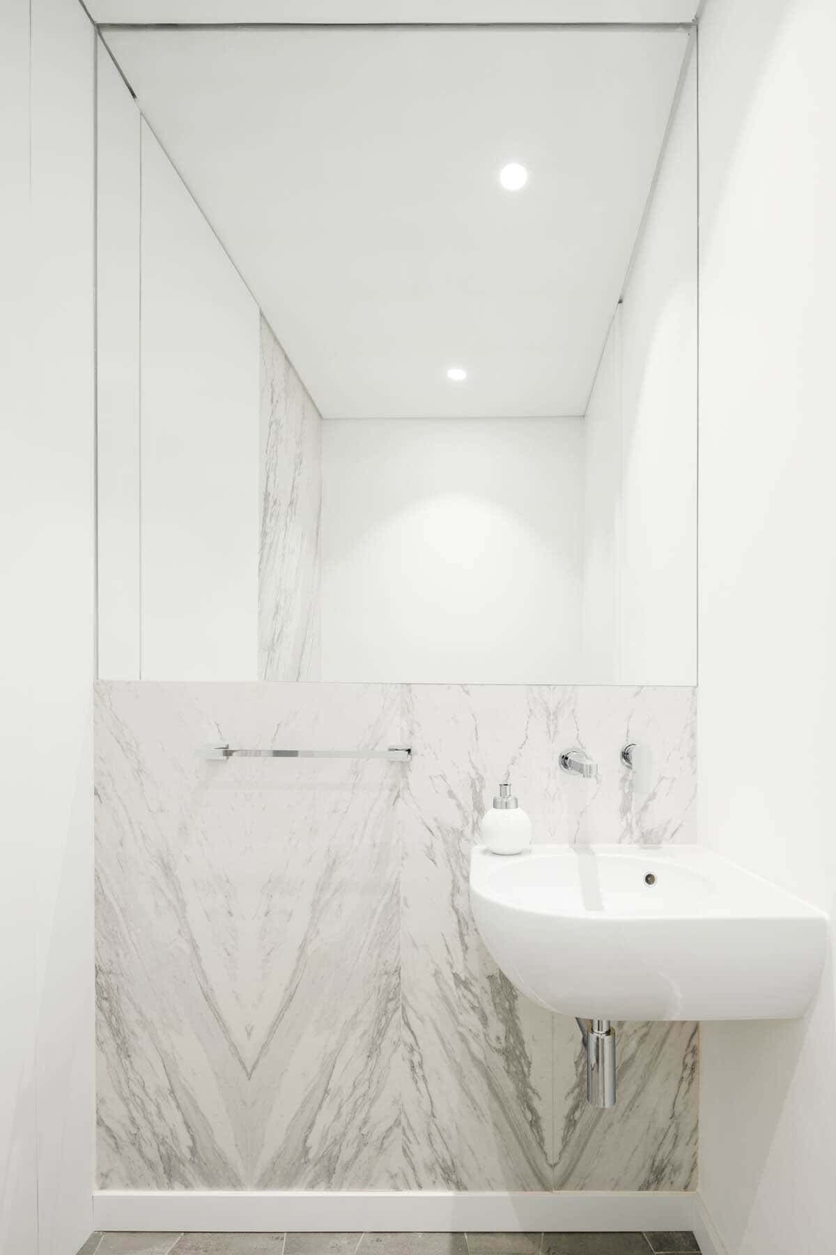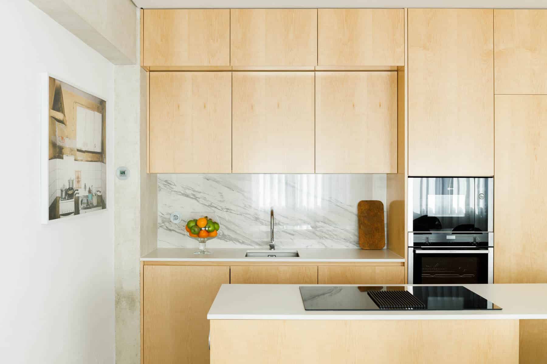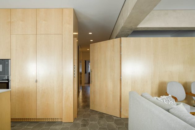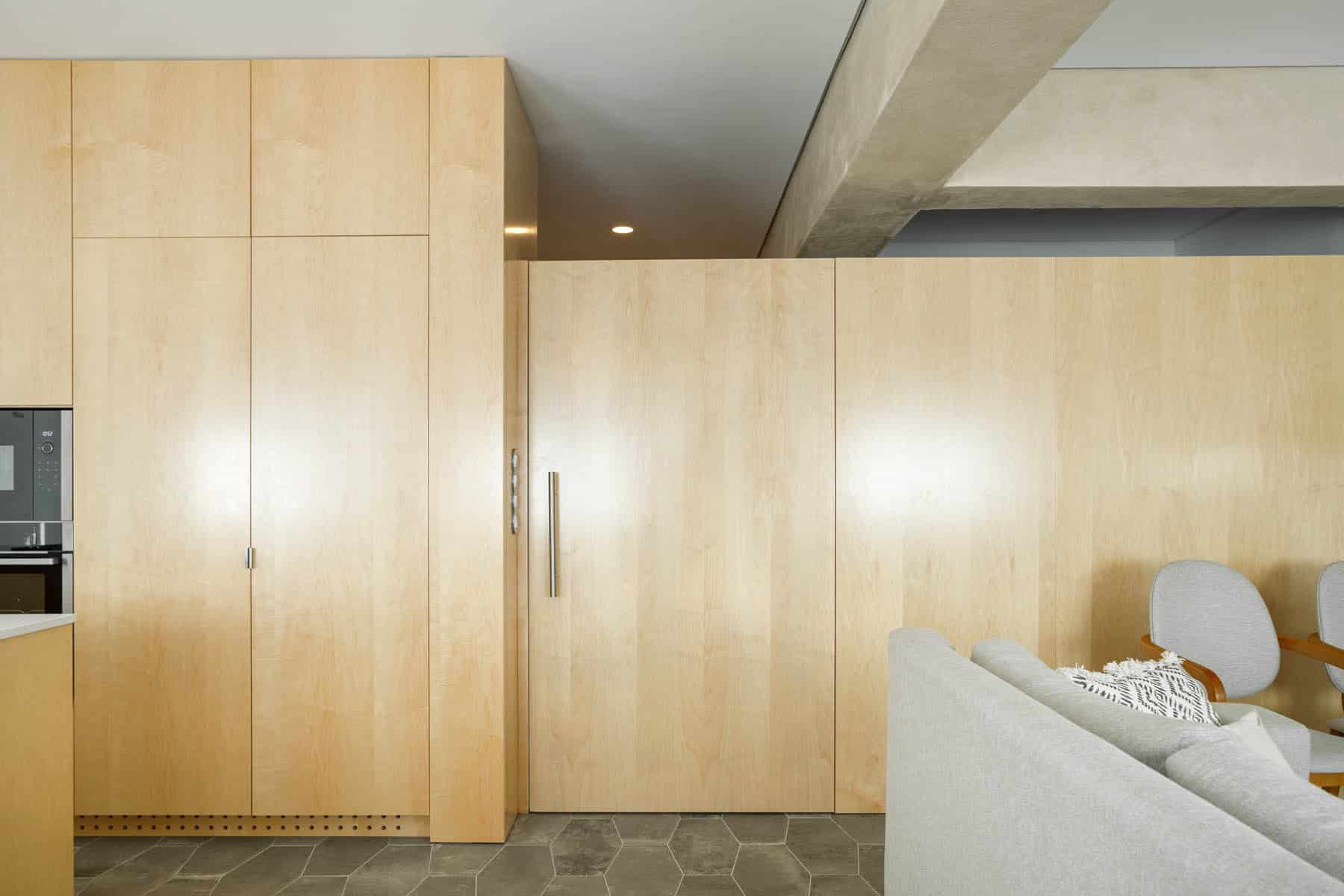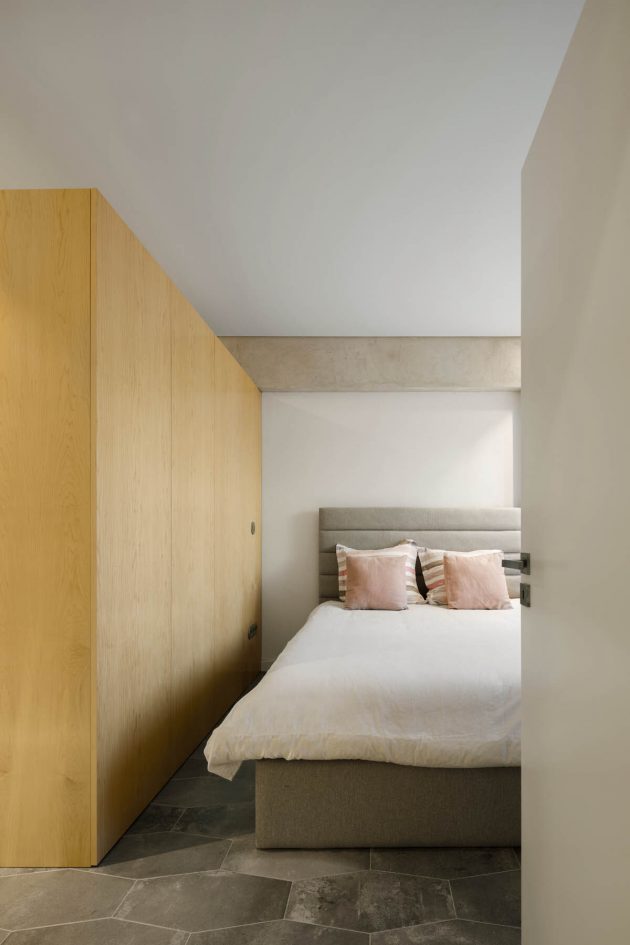 The original spatial layout was ‘back to front’, with the bedrooms facing the street to the south and the living room and kitchen at the rear of the building facing north. The layout was reversed to make it more functional: the living room and kitchen were moved to the front of the building, and the bedrooms to the rear.