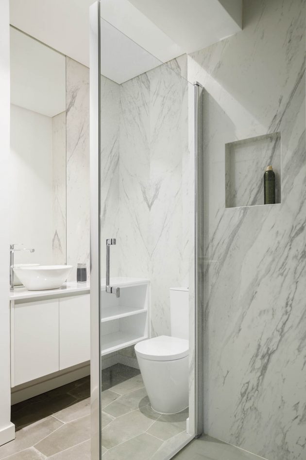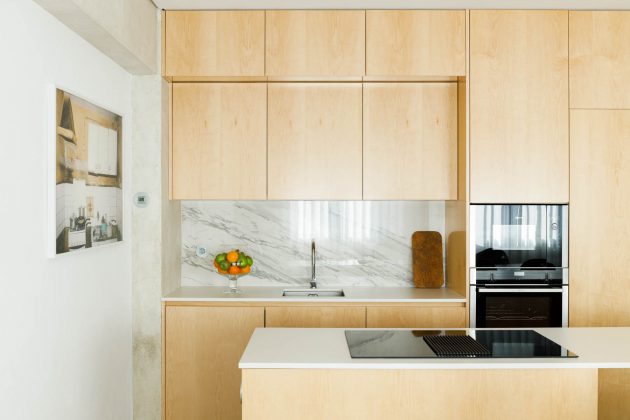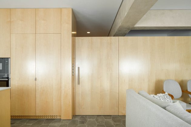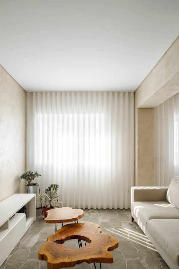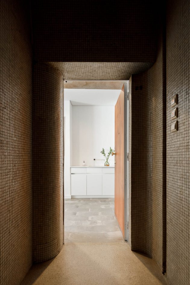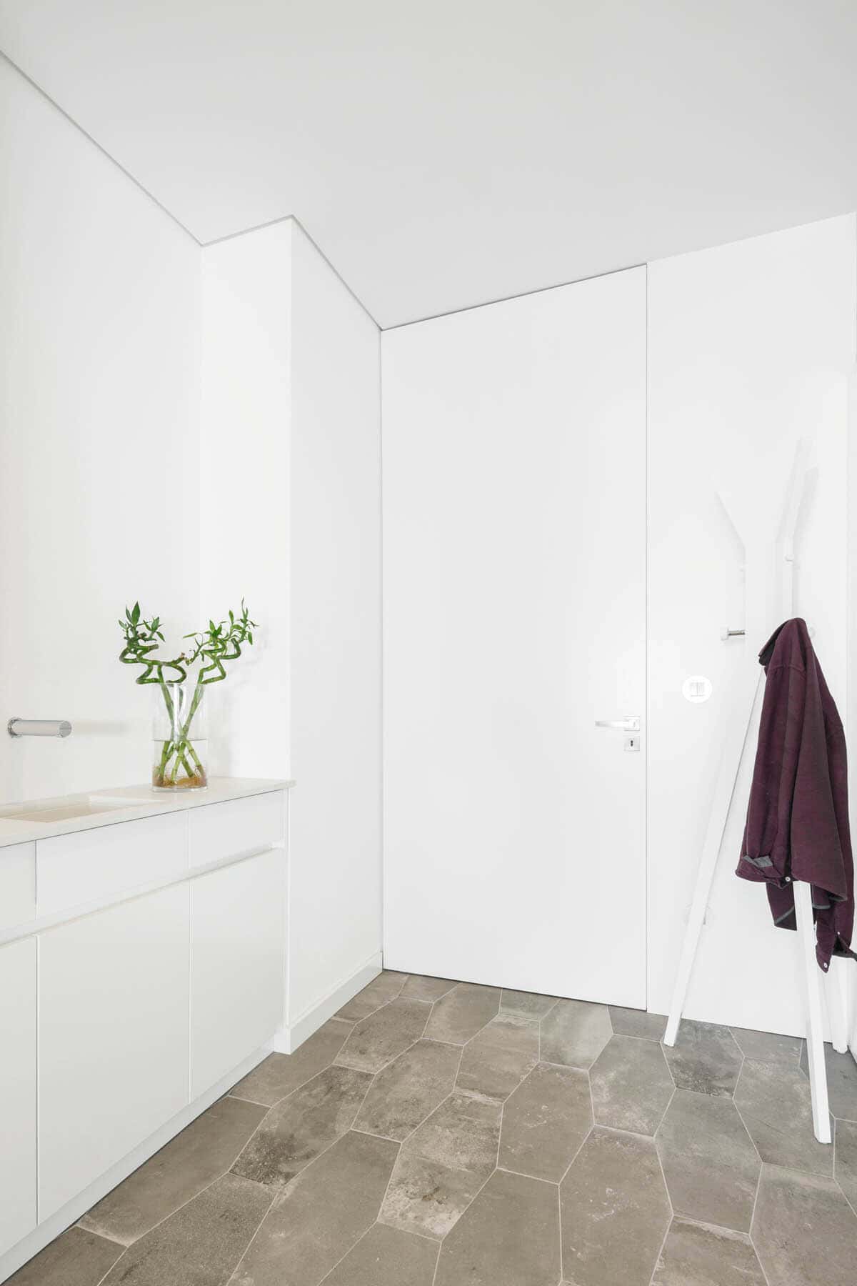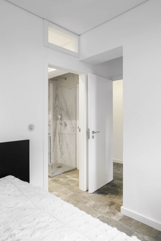 The materials used in the apartment are simple and clearly defined: expressive ceramic flooring, a radiant heating conductor; white, textured walls; a structure made visible by the use of cement-based mortar; and light-colored wooden blocks at sporadic intervals providing a warm, cozy feel.