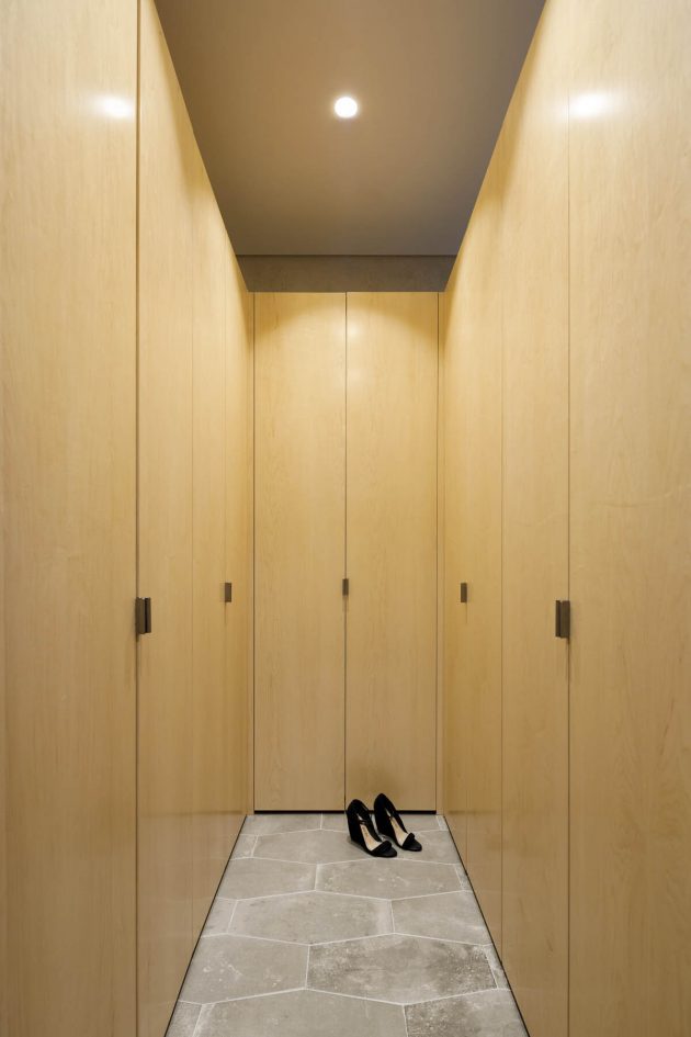 The apartment was renovated during the COVID-19 pandemic. This meant that the construction process had to be adapted for safety reasons, especially as the site had no outside space. In the hall, an area of transition from outdoors to indoors, a small sink and a shoe rack were installed to encourage new domestic habits.