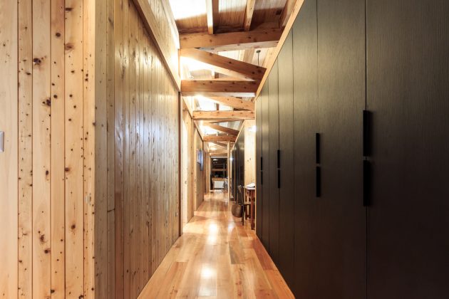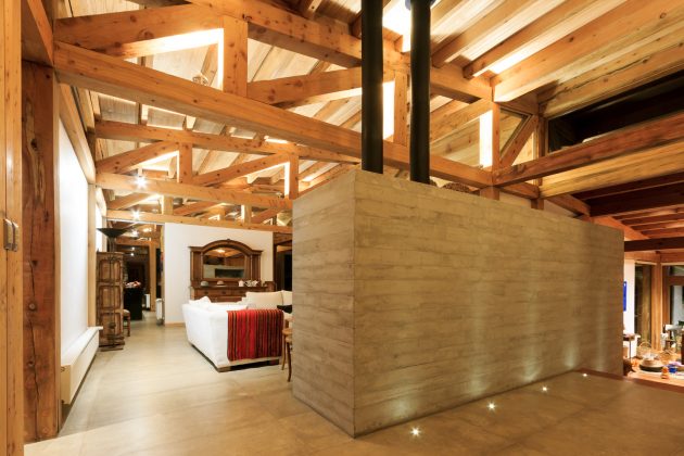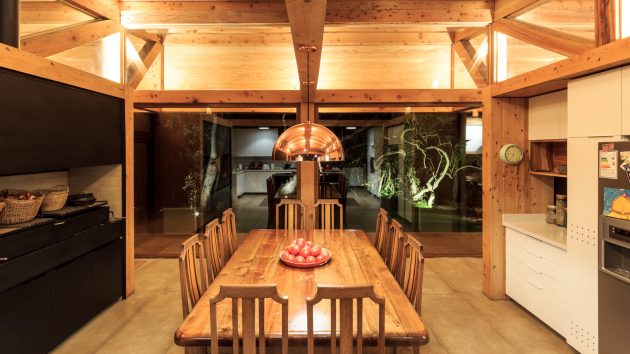 Therefore, the architectural program flows and spills by the North-East wing where the bedrooms are located or the North-West wing where you will find the social chambers; between them, only the intercommunication staircase. The open and continuous interior is modulated by the constant rate made of the repeated solid wood trusses. These are made of 8×8” Cypress’s logs as the columns and beams and configure large slightly inclined planes at the ceiling.