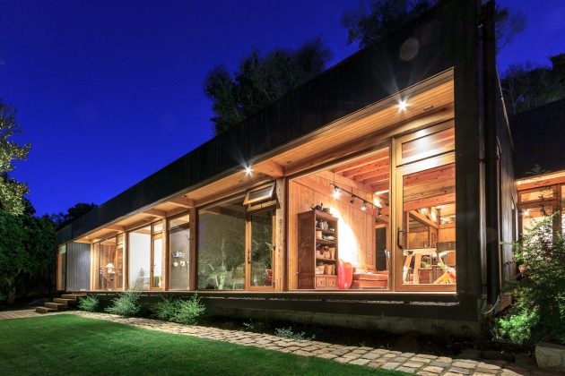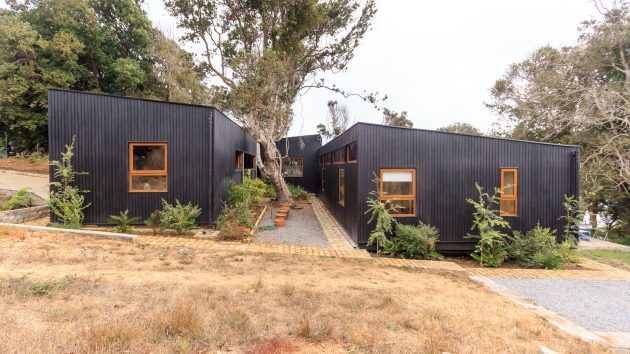 In this way, the architectural program resolves in basic and essentials volumes with, literally, longitudinal black containers sitting in the descending levels of the edge and unaligned to not alter or touch the endemic and centennial vegetation of Peumos, Boldos, Ulmos.
