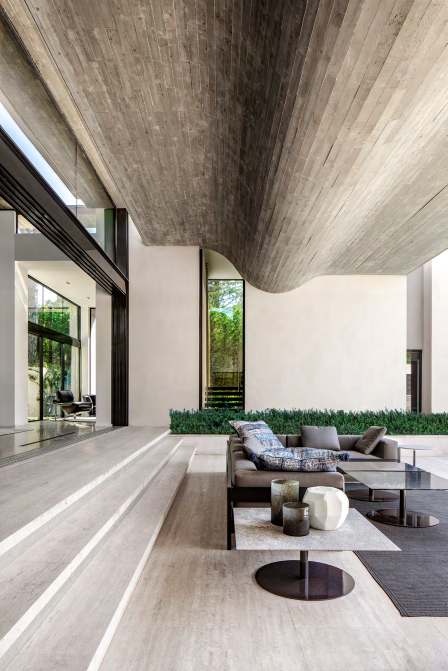 Situated on a long, narrow plot that backs onto a serene pine forest, the villa was inspired by the site’s volumetric beauty beneath the pine canopies. “We wanted to amplify that feeling of spaciousness,” notes SAOTA Director Phillippe Fouché, the lead architect on the project.