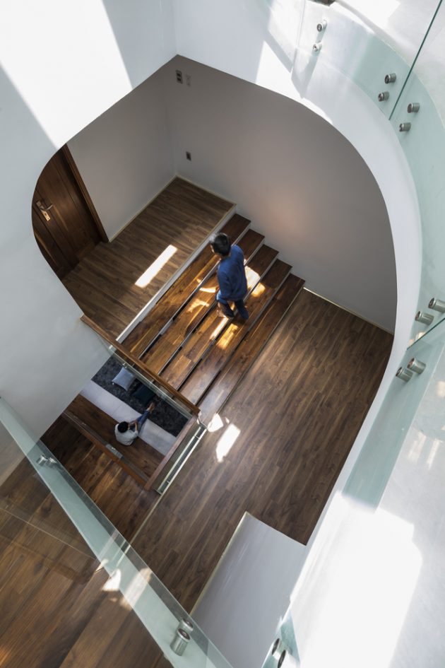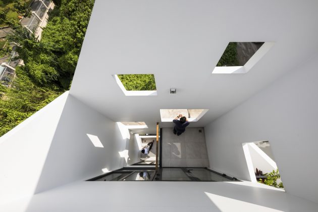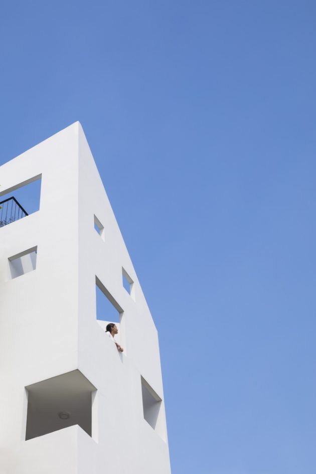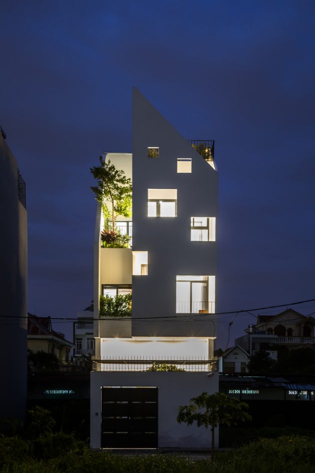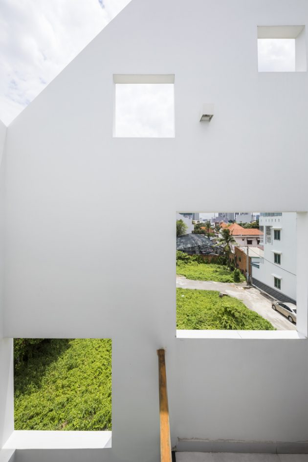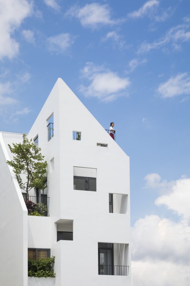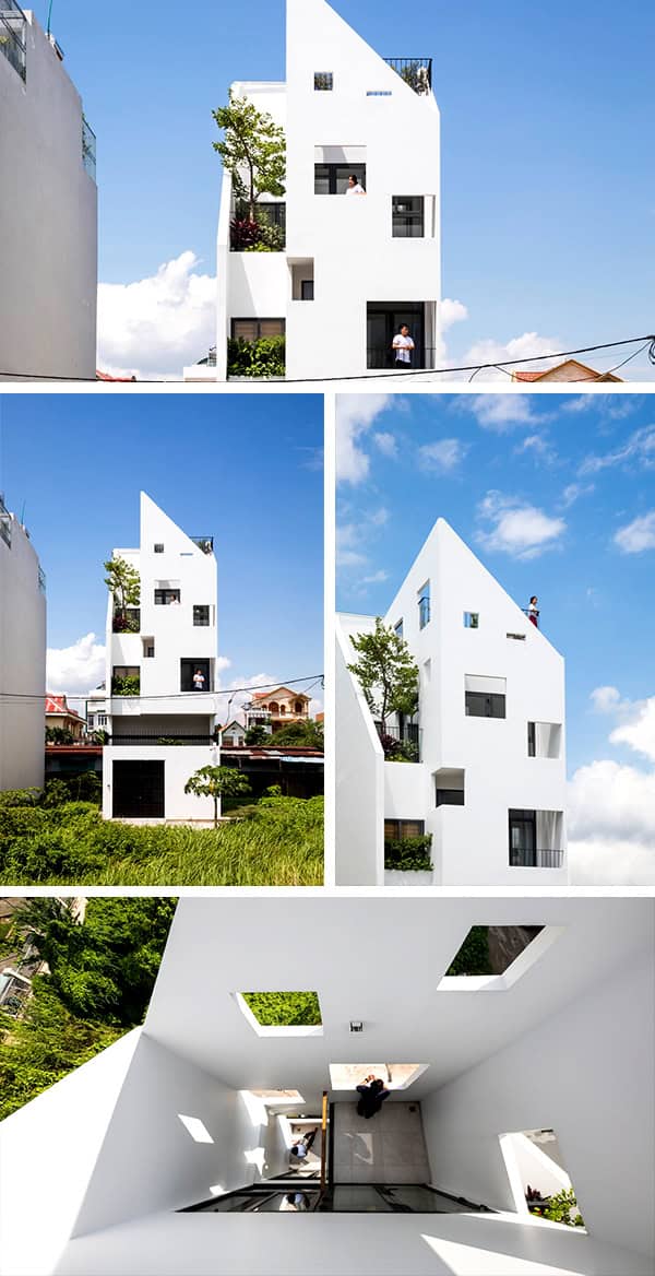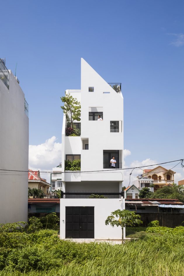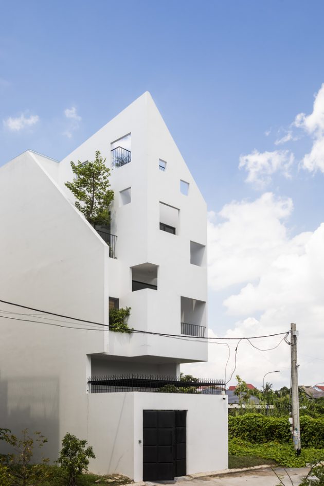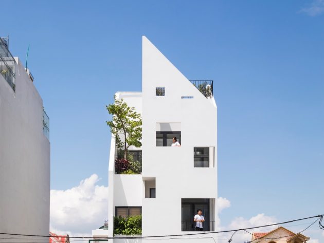 The Lien Thong House is a contemporary residence designed and built for a young family in the An Phu district of Ho Chi Minh City in Vietnam. Its irregularly geometric and radiantly white shape stands out from the surrounding buildings but also delivers plenty of natural light inside. Designed by 6717 Studio, this home offers just over 900 square feet spanning across three floors.