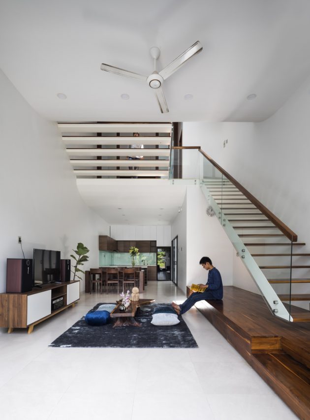 Lien Thong house where the young family including the married couple and their children have lived is designed by contemporary style. Recently, the family has stayed in 2 districts, Ho Chi Minh City Vietnam. Based on the method of the split level floor, the house is free for an advance. According to the application of the structure technique, there are lots of open spaces where the members can sit to relax, for example, the long bench in the living room and the long steps of the stair in the middle of the house. In addition, there is not any limitation among the spaces, so the parent can watch their children while they do housework. This is the reason that the house is called Lien Thong.
