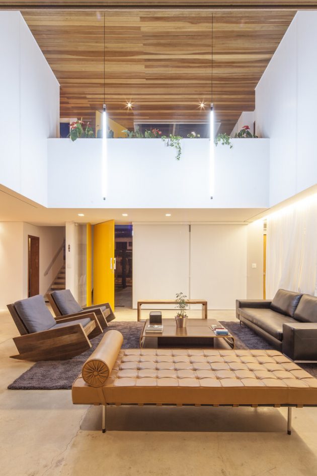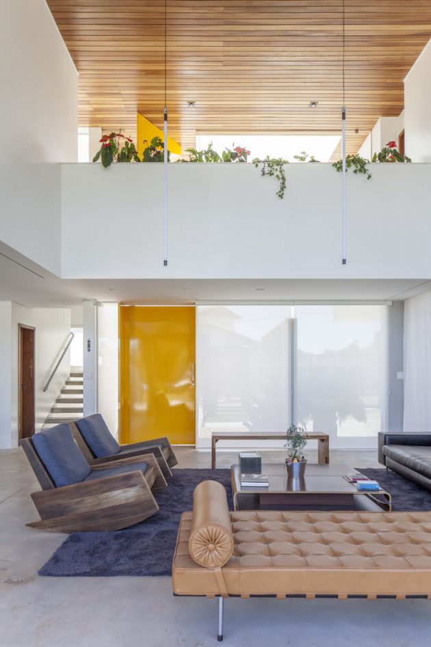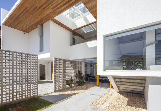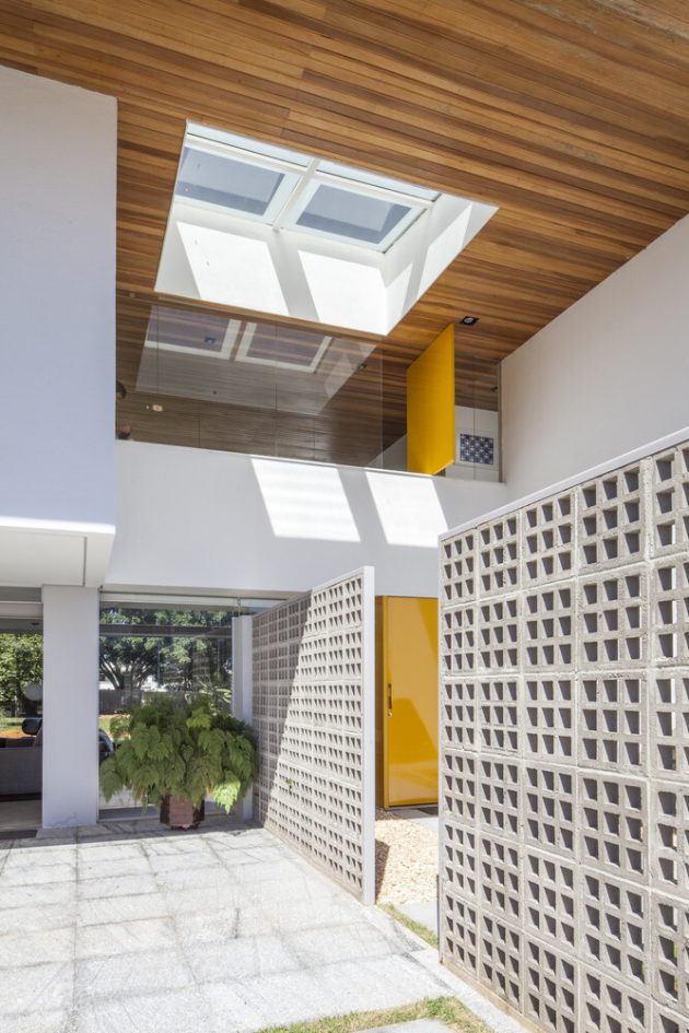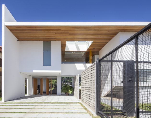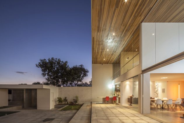 The interior opens to a series of voids and outdoor courts, alternating solids and emptiness, giving depth to the massing and allowing daylight, cross-ventilation and visual relief. The roof’s underside is lined with natural wood, visible from much of the house, giving a warm texture against the white surfaces of walls and structure.