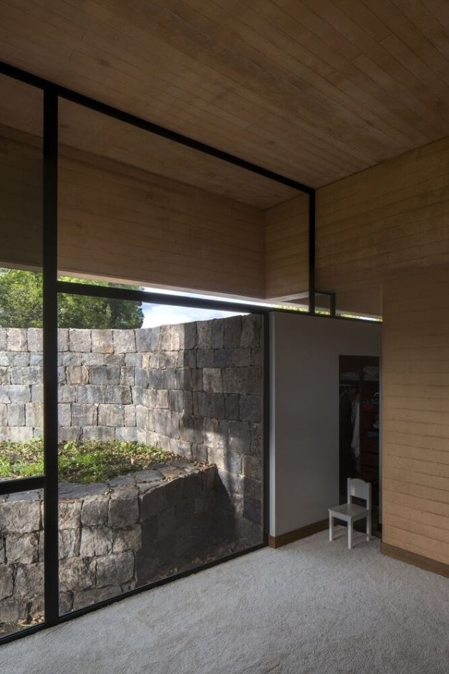 The residence’s approach to landscape is equally intentional. Inspired by nearby gardens and rustic stone elements, the house engages the site’s immediate earth and vegetation, allowing the setting to act as a formative backdrop to daily life while tempering the architectural mass within its context.