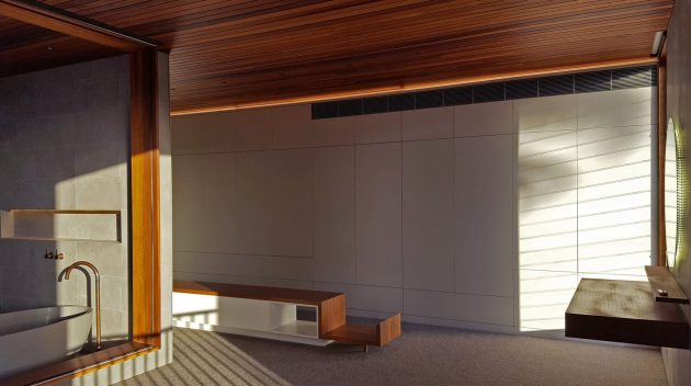 Downstairs, the interconnected kitchen, living, dining and outdoor spaces create highly interactive and engaged spaces designed to accommodate large groups easily. Smaller groups can retreat to the media room which overflows into the private entry courtyard. Secure storage for sports equipment is accessible from the entry, which makes it easy to grab a surfboard and head to the beach after work or school. A galley style kitchen and island bench include carefully considered lighting, while custom built-in seating provides guests somewhere to recline and converse. The pool shares a clear wall with the double height social space and acts as a visual connection between the interior and exterior spaces, refracting natural light throughout the lower level of the house.