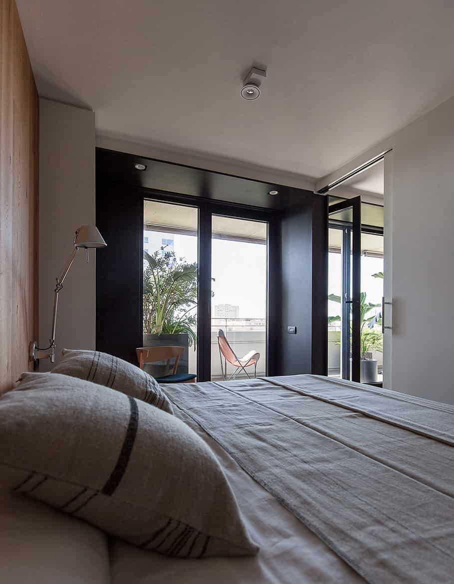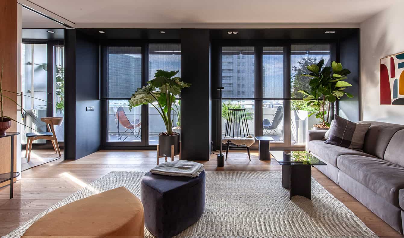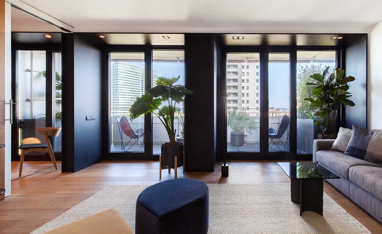Large graphite-framed windows in the living/bedroom zones connect directly to the terrace. The aluminum frame hides motorized blinds and lighting fixtures, and a planter zone softens the transition to outdoors. The terrace is finished in bush-hammered graphite stone and furnished with lounge pieces that echo the interior palette.