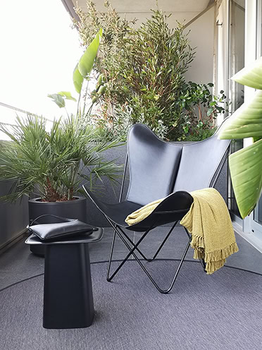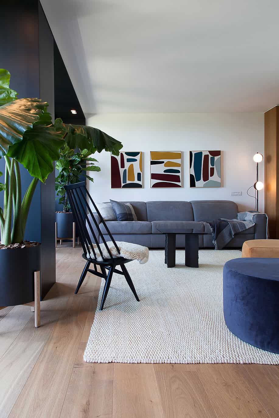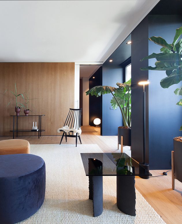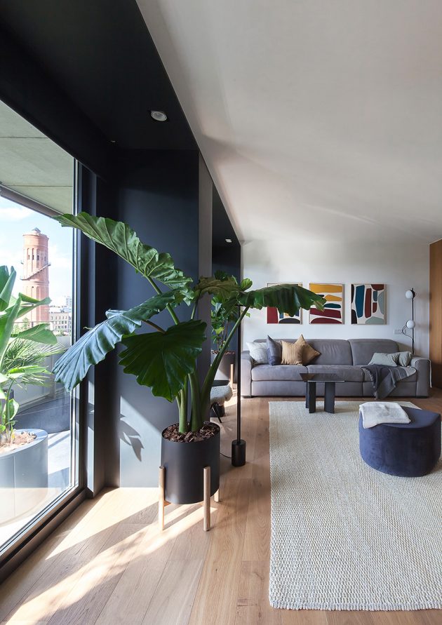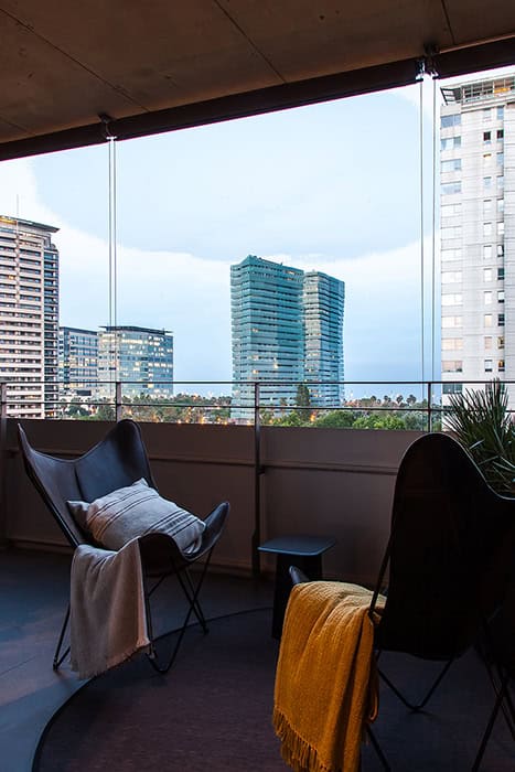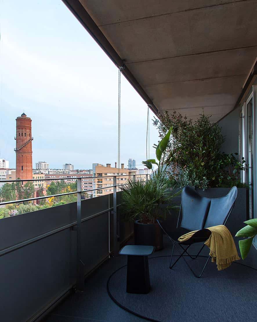 Large graphite-framed windows in the living/bedroom zones connect directly to the terrace. The aluminum frame hides motorized blinds and lighting fixtures, and a planter zone softens the transition to outdoors. The terrace is finished in bush-hammered graphite stone and furnished with lounge pieces that echo the interior palette.