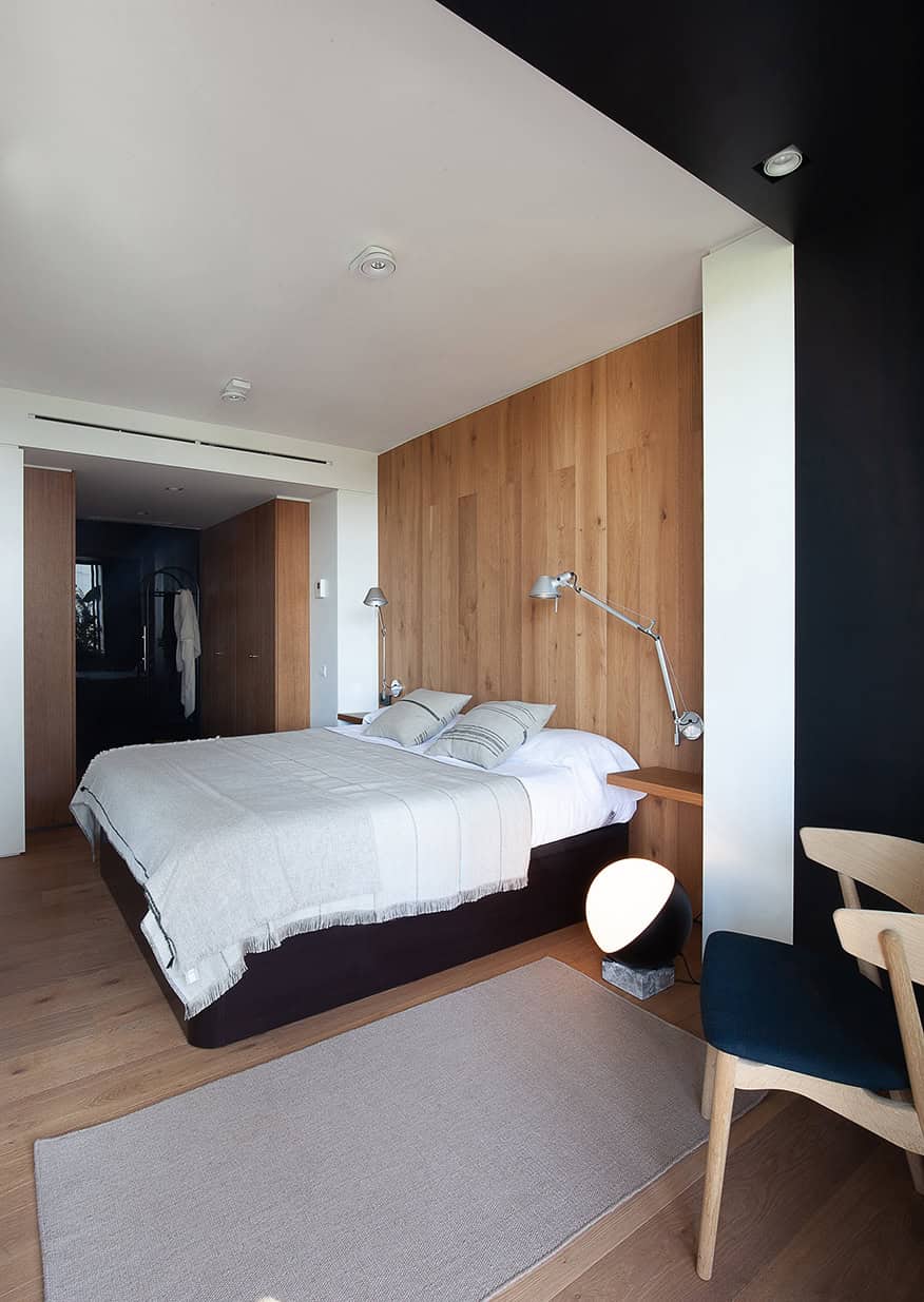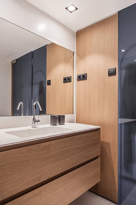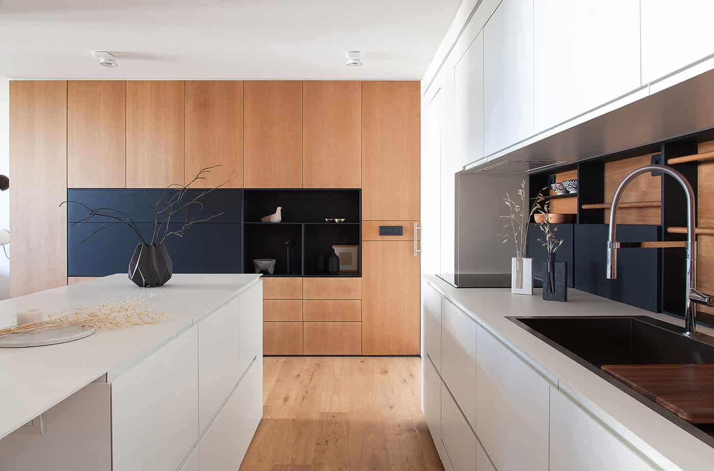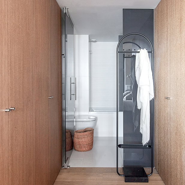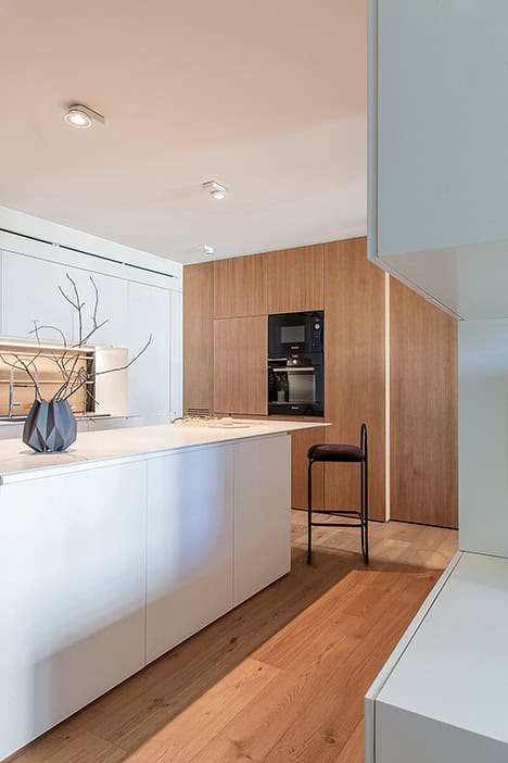 To optimize space, YLAB introduced floor-to-ceiling cabinetry around the perimeter—replacing walls, hiding doors, and interlocking storage zones. Oak veneer panels alternate with white lacquer finishes, creating a subtle rhythm between wood warmth and neutral expanses. Doors—both swinging and sliding—are flush with the cabinetry, maintaining visual continuity.