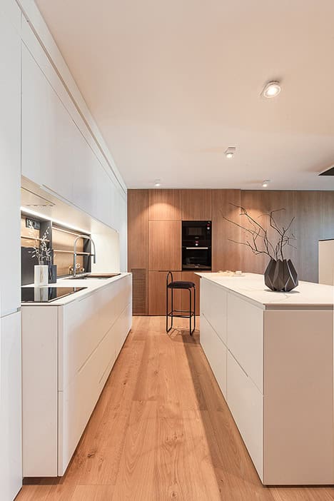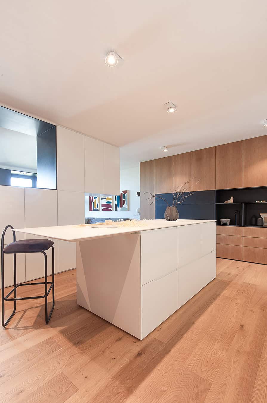 The kitchen island, clad in white lacquer, anchors the social core. Its design integrates a hood, sink, and hidden storage. Floating back shelves display curated objects, while seating along the island lets guests face both cooking and views.