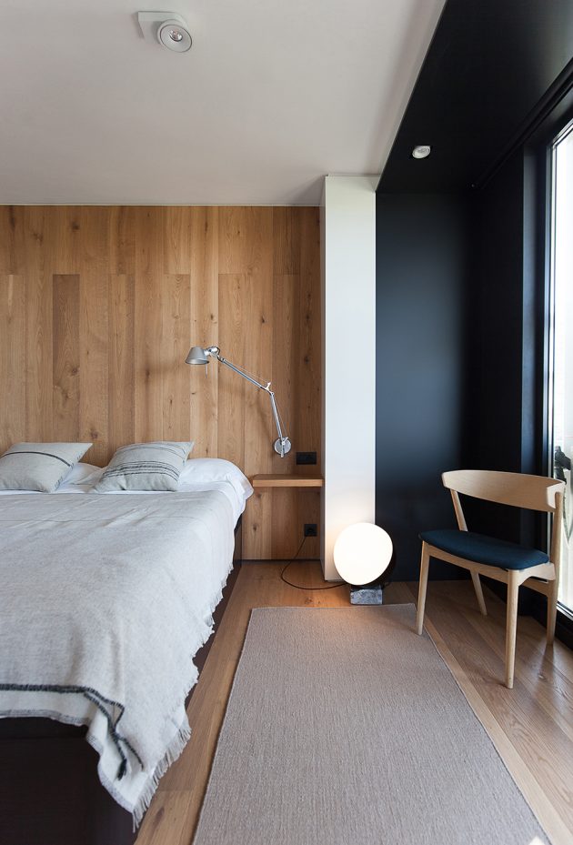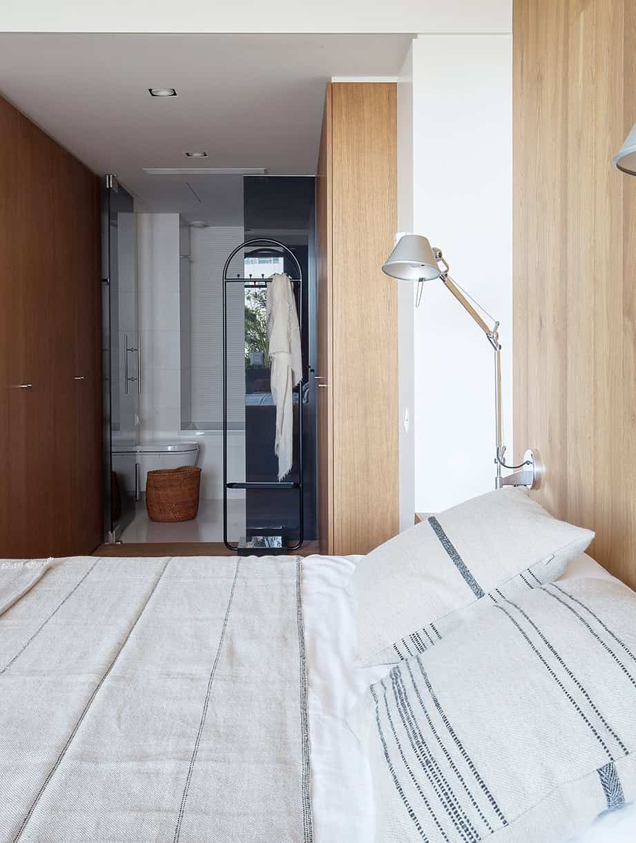 The master bedroom includes a reading corner, discreet wardrobe zone, and upholstered bed—all wrapped in soft neutrals. The bathroom features wall-mounted oak washbasin, suspended fixtures, and clean tile accents. Materials are chosen for simplicity and tactile comfort, avoiding visual clutter in the compact footprint.