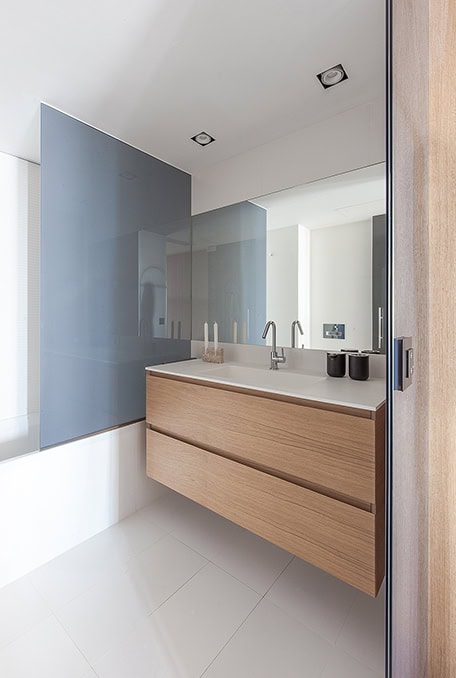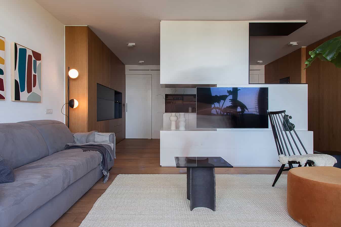 Natural light floods the flat from its sea-facing façade. YLAB controls glare with hidden automated blinds, and frames views so that even when closed, the architecture reads as coherent and calm. The translucent transitions, recessed cabinetry, and perimetric detailing all orchestrate a sense of serenity and openness.