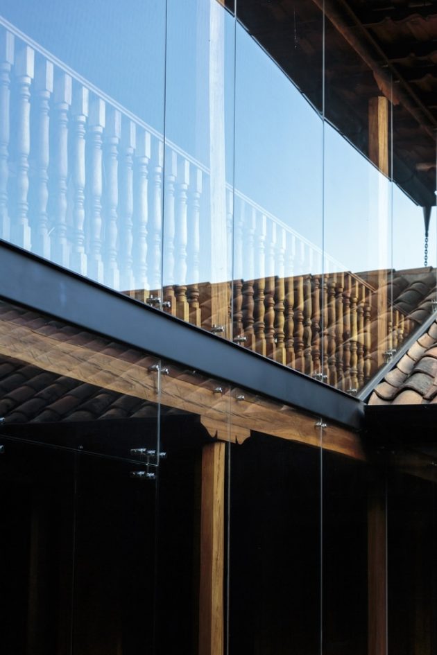 A glass façade is placed before the interior galleries in order to increase thermal comfort in the areas as well as to protect the wooden structure from the rain and wind. These are the main atmospheric phenomena that were responsible of the deterioration stage which this house presented before it was renovated.