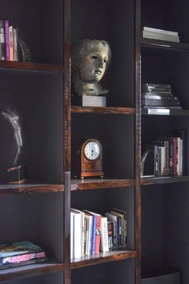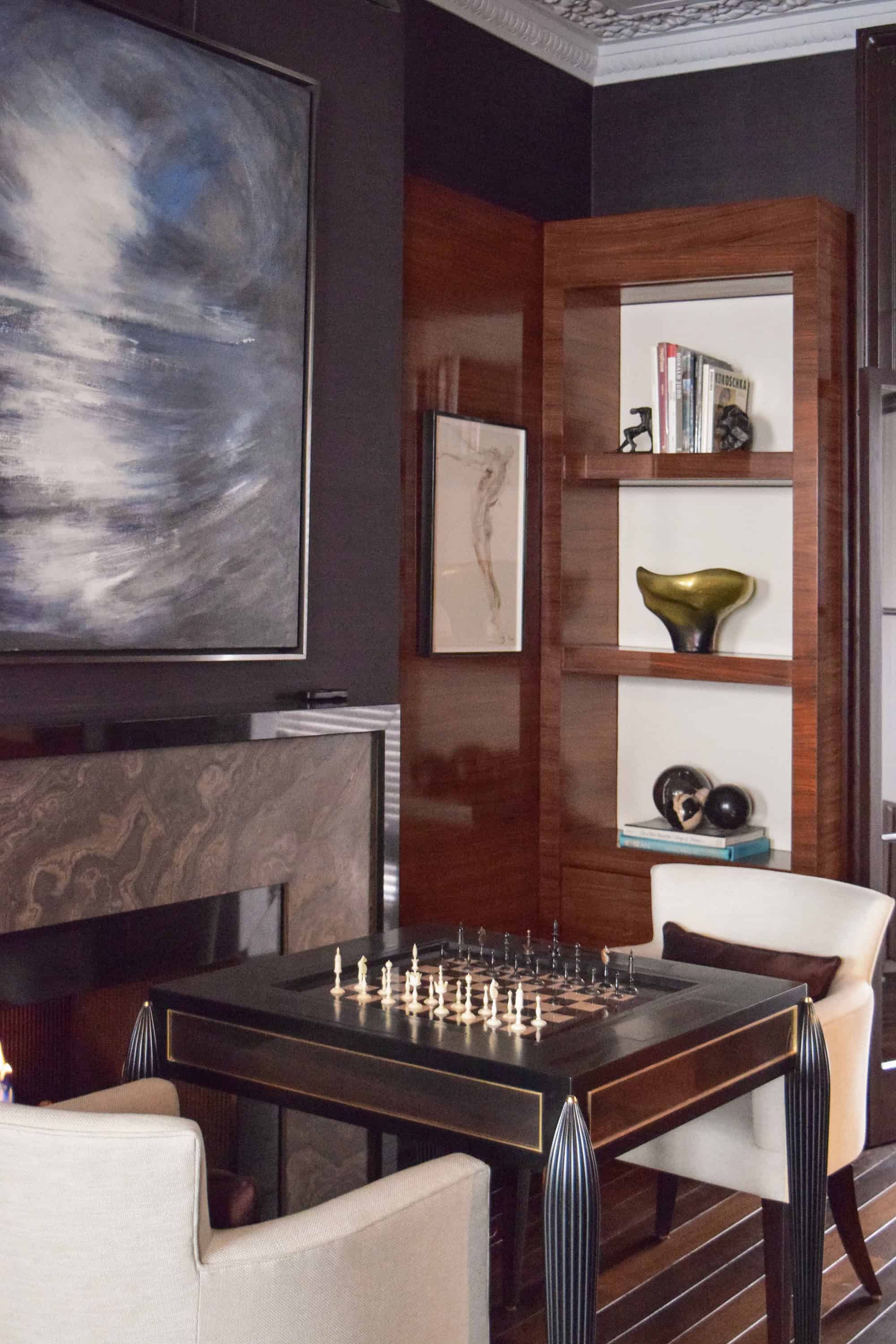 Highlights include a bespoke card room, a particular requirement from the client who is passionate about chess. With hand-polished Santos Rosewood panelled walls, which provide the backdrop for the artwork. An exquisite bespoke card table takes centre stage and a specially sourced set of antique Indian chess pieces complete the story.