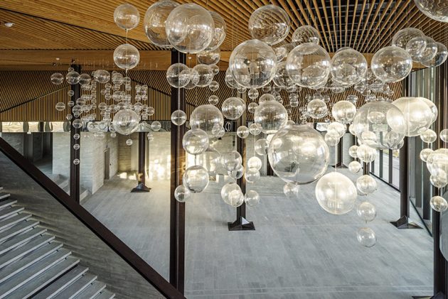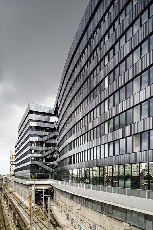 The whole building is clad with enameled terra cotta, a reference to the industrial buildings standing along the train tracks. Applied on all the façades, this skin comes alive, its appearance changing according to the direction in which the façades are facing and according to the quality of daylight and what is happening in the sky.
