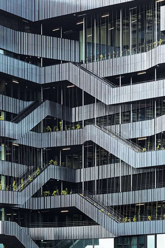 The thinking about the domestic ambiance of work spaces led to an alternative design for circulations encouraging friendliness and spontaneity. Thus, exterior and interior spaces have been interwoven across all façades of the building, thereby facilitating the smooth flow from one area to the next and ensuring visual continuity from the outside, form the ground floor up to the roof, where a hanging garden offers an entirely new kind of work space.