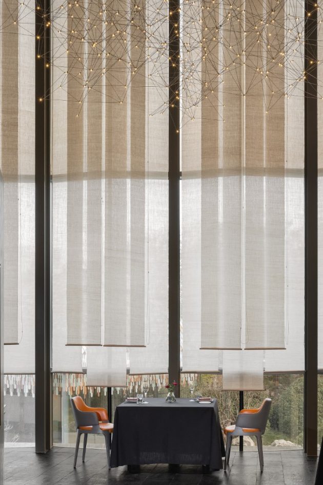 The architectural dome is a sloping slope. Based on the dynamics, Liu Daohua designed different suspended ceilings in each space, so that the restaurant is always full of uncertain changes under different mood lights. Changing situations were set up in the overall interior, triggering more possibilities and visual tension for catering design. The starry ceiling is a bright art installation, with small and delicate crystal chandeliers intersecting with silk threads. As a result, the designer created cosmic stars, in order or disorderly, providing a lot of warmth for dining people.