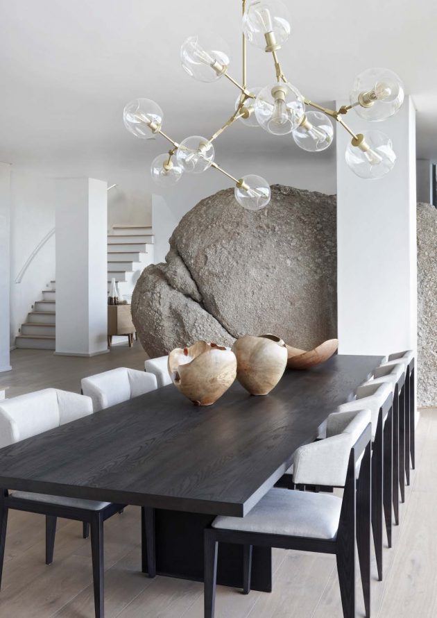 The ground floor formal lounge area is soothing in its chalky monochromatic palette, allowing natural light to sculpt and enhance the interior architecture and stucco walls. The furniture uses strong lines, clean forms and materials such as etched raw oak, vintage leather, satin brass and granite to create a timeless elegance.