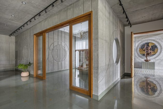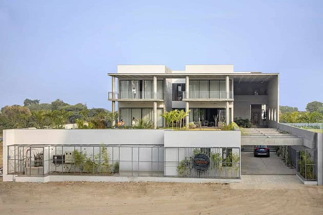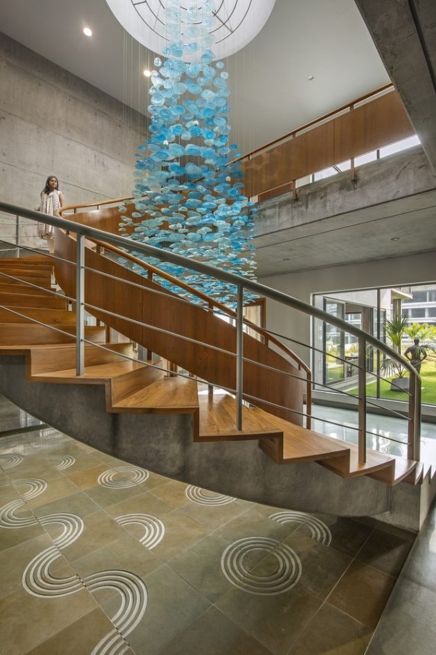 A large glass fenestration allows light to filter through the layout, drawing attention to unfinished surfaces. The zoning and layout are shuffled in the villa in such a manner that whenever and wherever one sits the expanse of green vistas should not be missed. The ground floor of the building is a massive parking lot. A post-tension structure is used to avoid columns up to 50 feet wide. A pergola set in an open grid design offers a dreamy entrance pathway to the villa. The entrance on the first floor with beautiful steps and a landscape on the sideway is adorned with distinctive circular cutouts with murals by Avinash Gondaliya.