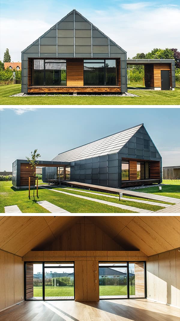 - The house is fitted with a “glass shield”, which wraps around the roof and all façades of the building, protecting its wooden construction against rain and wind. The glass shield is made of recycled glass and in principle is indestructible. The shield is one continuous surface, unbroken by vent pipes – again ensuring extended service life by avoiding leakage from joints.