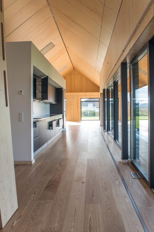 Maintenance-Free House B has been constructed as a long house with a covered east-facing entrance located exactly in the centre of the building’s longitudinal side and a 40-degree pitched roof. The interior of the house has been designed as a wooden “box”: one large continuous room with open beams and furnished with low closed boxes. Daylight enters through the four skylights, from the entrance area, from the full-height windows and doorways in the end walls, and from an approx. 10-meter long glass section.