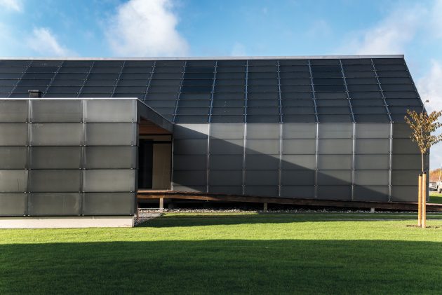•          The house is fitted with a “glass shield”, which wraps around the roof and all façades of the building, protecting its wooden construction against rain and wind. The glass shield is made of recycled glass and in principle is indestructible. The shield is one continuous surface, unbroken by vent pipes – again ensuring extended service life by avoiding leakage from joints.