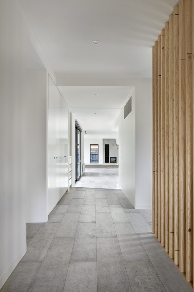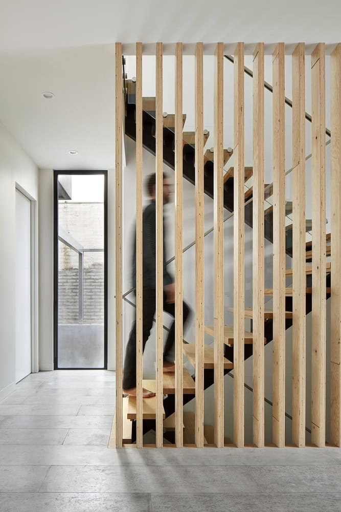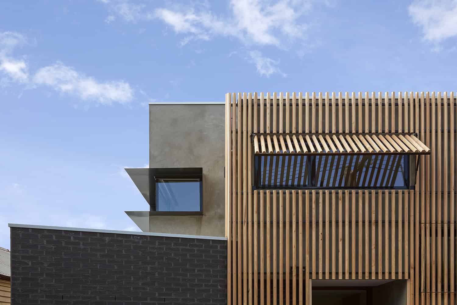 One of the challenges with this project was to create a home that looked contemporary and edgy, yet timeless. The vertical silvertop ash battens achieves the aesthetic required from the front, but also provides a practical screening from the sun for the study.”