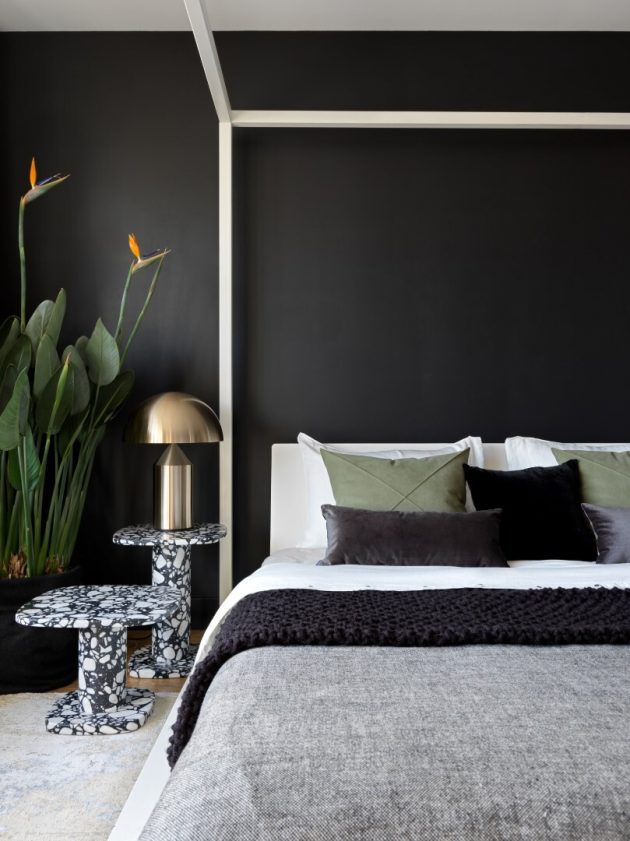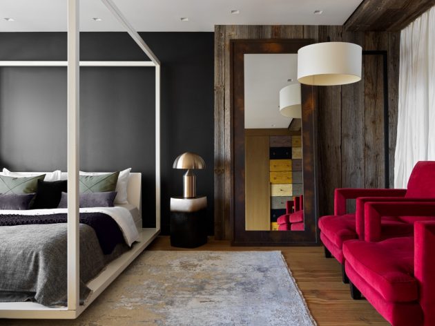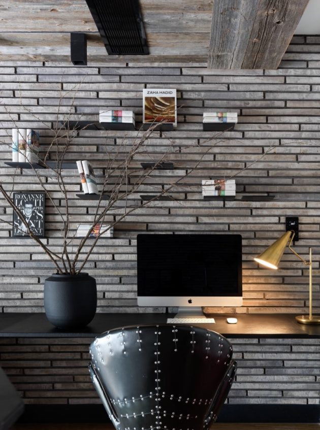 The ceiling and part of walls are clad with barn planks brought from old, disassembled Canadian barns. It is the designer’s way to underline the history of the industrial building converted into housing.