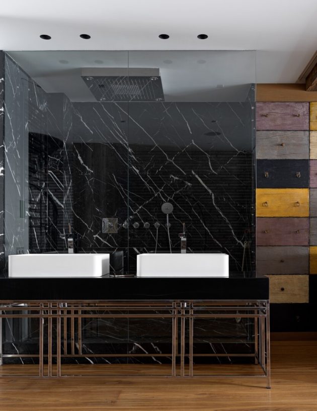 On the second floor, there is a master bedroom and a study. These two zones are separated by a shower cabin with an overhead shower. Its walls are clad in Negro Marquina marble. On the opposite side, designers put a console with a chrome base. The glossy black quartzite worktop accentuates the whiteness and graceful shapes of the washbasins by “Antonio Lupi”. The freestanding bathtub made by “Devon-Devon” is installed near the large stained glass, so you could contemplate the Moscow view.