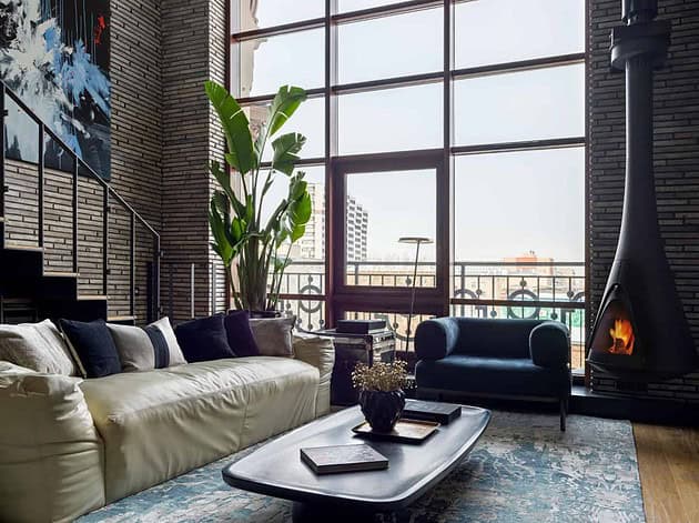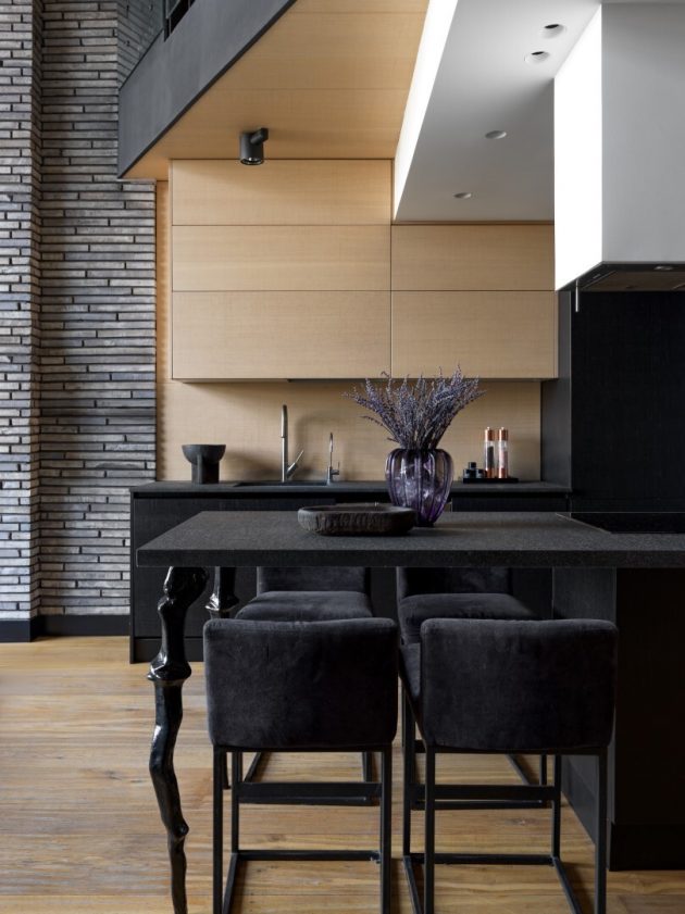 On the first floor of the apartment, there is a kitchen and a large living room with a second row of windows. Designers used textured and raw premium-quality materials to create the atmosphere of the American lofts. The walls are decorated with spectacular transom bricks Kolumba manufactured by Danish company “Petersen”.