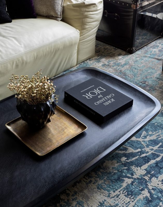 Suspended spherical lamps were custom made by the Italian company “Catellan Smith”. The floor lamp and frames in oxidized lacquered metal with a “fixed rust” effect were projected by INRE designers. The hanging fireplace in the living room is functional and it was constructed by the developer. Next to the fireplace designers have created the relax zone with a charismatic leather armchair and a low coffee table by “Baxter” and a floor lamp “Oluce” curved in the shape of the letter Z.