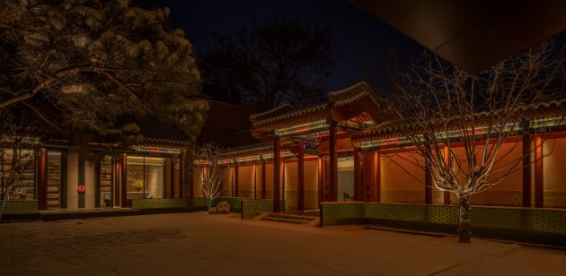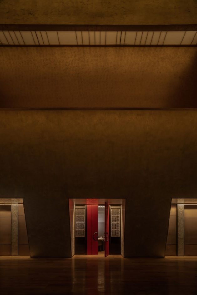 Beyond the central courtyard is the third courtyard – referred to as “the principal yard” – which is connected to a semi-open banquet hall. The ceiling and upper walls of this hall is decorated in gold lacquer, which together with the grey walls and crimson door posts, create an elegant, contemporary atmosphere. “We reconstructed the internal tilt facade of this hall according to a contemporary architectural scale and with modern materials,” says Liu. “On a sunny day, this gilded hall changes with the light and shadow, as if it were breathing,” he adds.