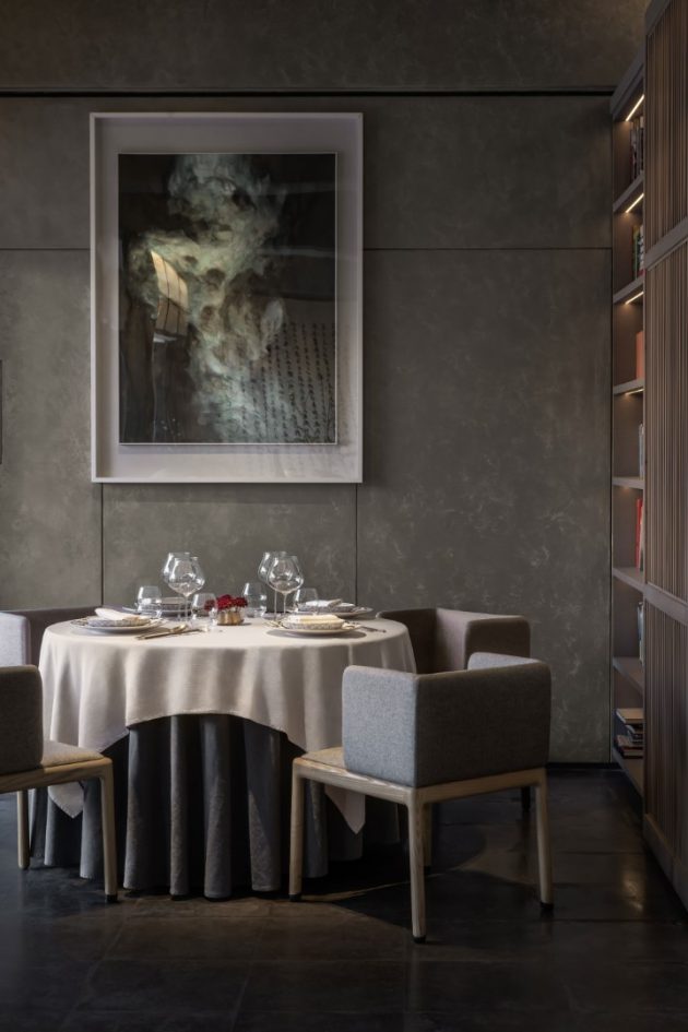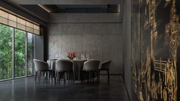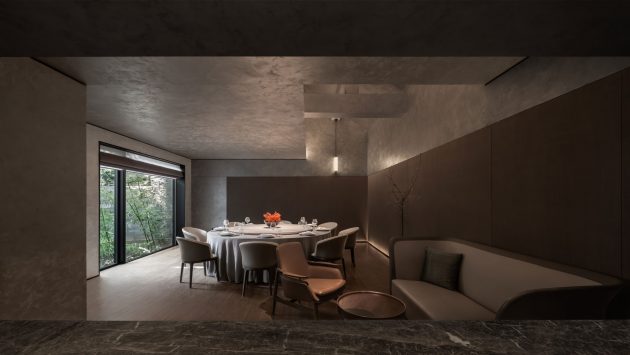 The courtyards present a wonderful way to frame skyline views and draw sunshine and fresh air into the interior spaces. The sunlight shining on the trees in these outdoor areas create interesting shadow play which adds to the poetic atmosphere of the restaurant,” Liu says.