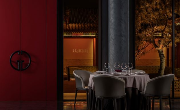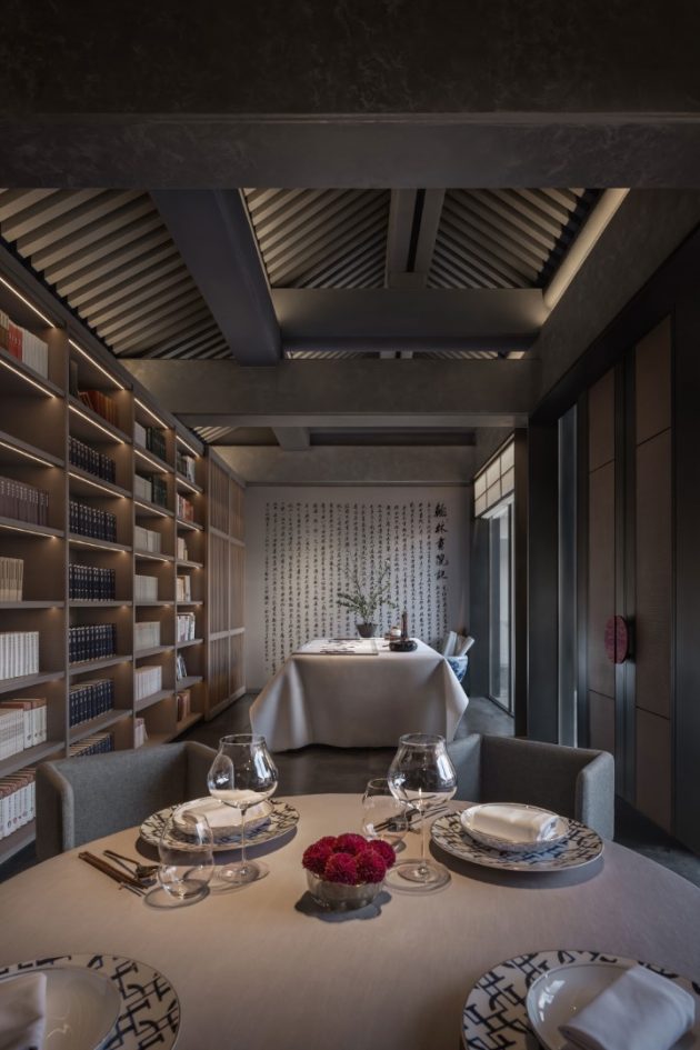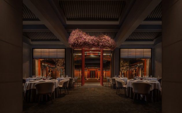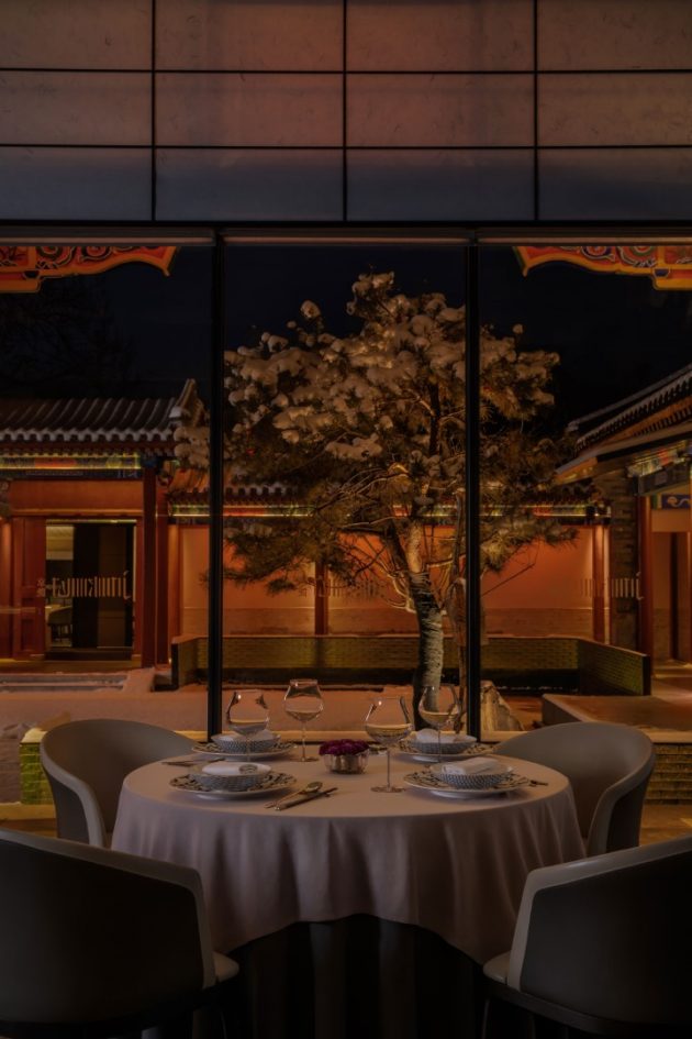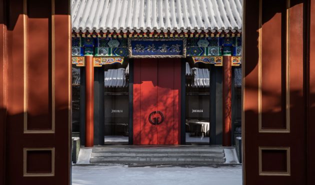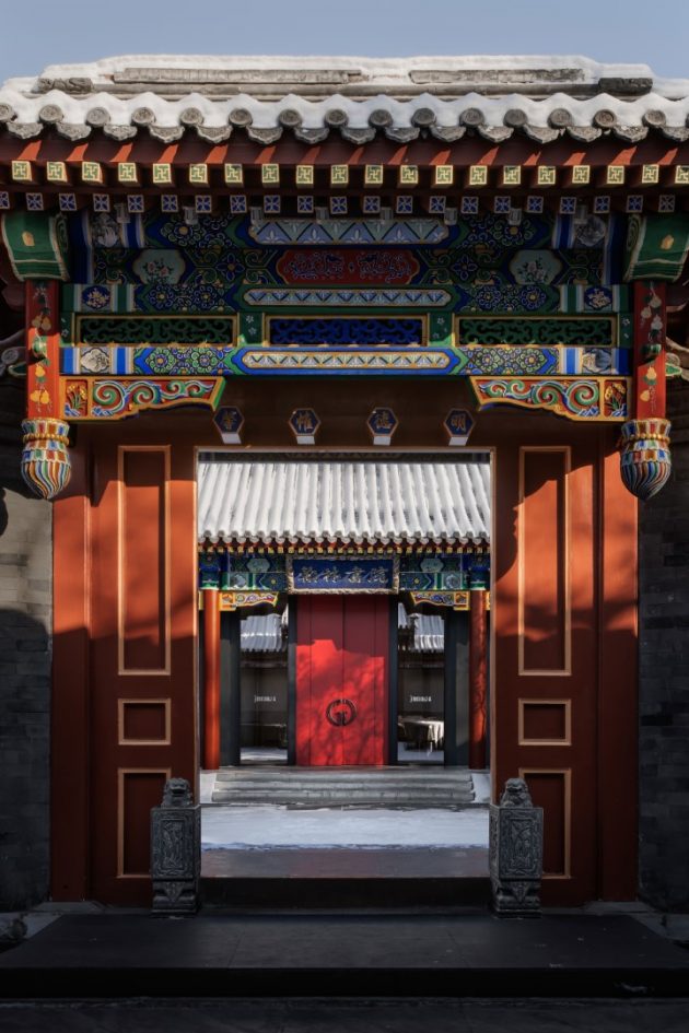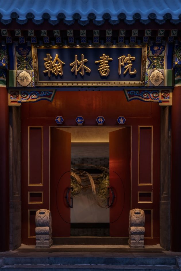 Tucked away near a temple in Beijing’s old town, in a hutong in Dongcheng District, the restaurant is set within a renovated, thirty-year-old, traditional, Beijing style, quadrangular, courtyard compound residence known as a siheyuan. Formerly a cultural venue called the Jinyang Hanlin Academy, the compound was transformed into an elegant dining destination that evokes the ceremonial splendor of Chinese imperial residences.