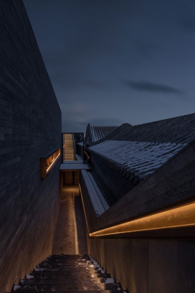 To the right of the entrance, is a terrace that functions as a three-dimensional viewing platform where guests can look down at the courtyards, the Beijing Imperial Academy and hutong beyond the compound’s walls, and also take in views of the sky above. A stone staircase leads up to this terrace. LDH installed mirrors panels on the wall of the staircase landing on the terrace level, so a reflection of Beijing’s old town and the golden roof of the Beijing Imperial Academy can be seen before guests step onto the terrace.