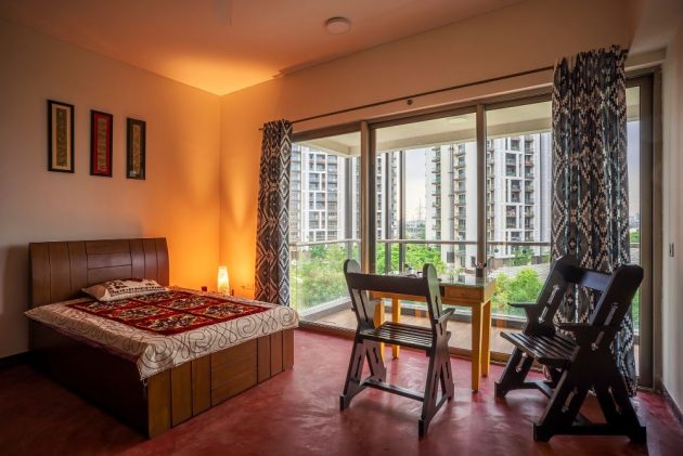 All rooms are naturally lit, with large glazing looking onto individual balconies. In order to retain the actual scale & height of spaces, no false ceilings were added. Energy efficiency being key, all private spaces have conventional LED fixtures in place. Design lights were provided only in the Public areas- both Living & Dining. The circulation galleries on both floors overlook an internal courtyard, highlighted with black metal French balconies, initially added for protection, and also double up to hold planters.
