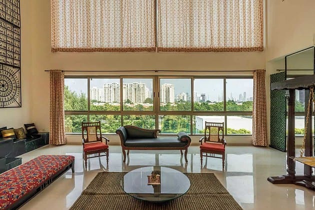 Elaborating on the color scheme of the residence, the intentional plaintiff white walls are a background to many dying glorious arts. The color Markat (or Emerald green in Sanskrit, symbolizing harmony, balance with nature, and also the owner’s birthstone) makes a constant yet discreet presence around various elements of the interiors. The dark green color can be seen on the double-height background wall of the Baithak Living room and the glazed jaali that segregates spaces. Emerald is also the factory finish color of the Low-E material board used to make all inbuilt cupboards and cabinets. It is also the omnipresent color of the limestone complemented by tones of ochre fossils, & bright primaries of Red & Yellow in the IPS flooring. The fabrics around the house are lightweight single layer florals on neutrals and an exalting rhubarb on customized muslin, contrasting the green tones across the living room.